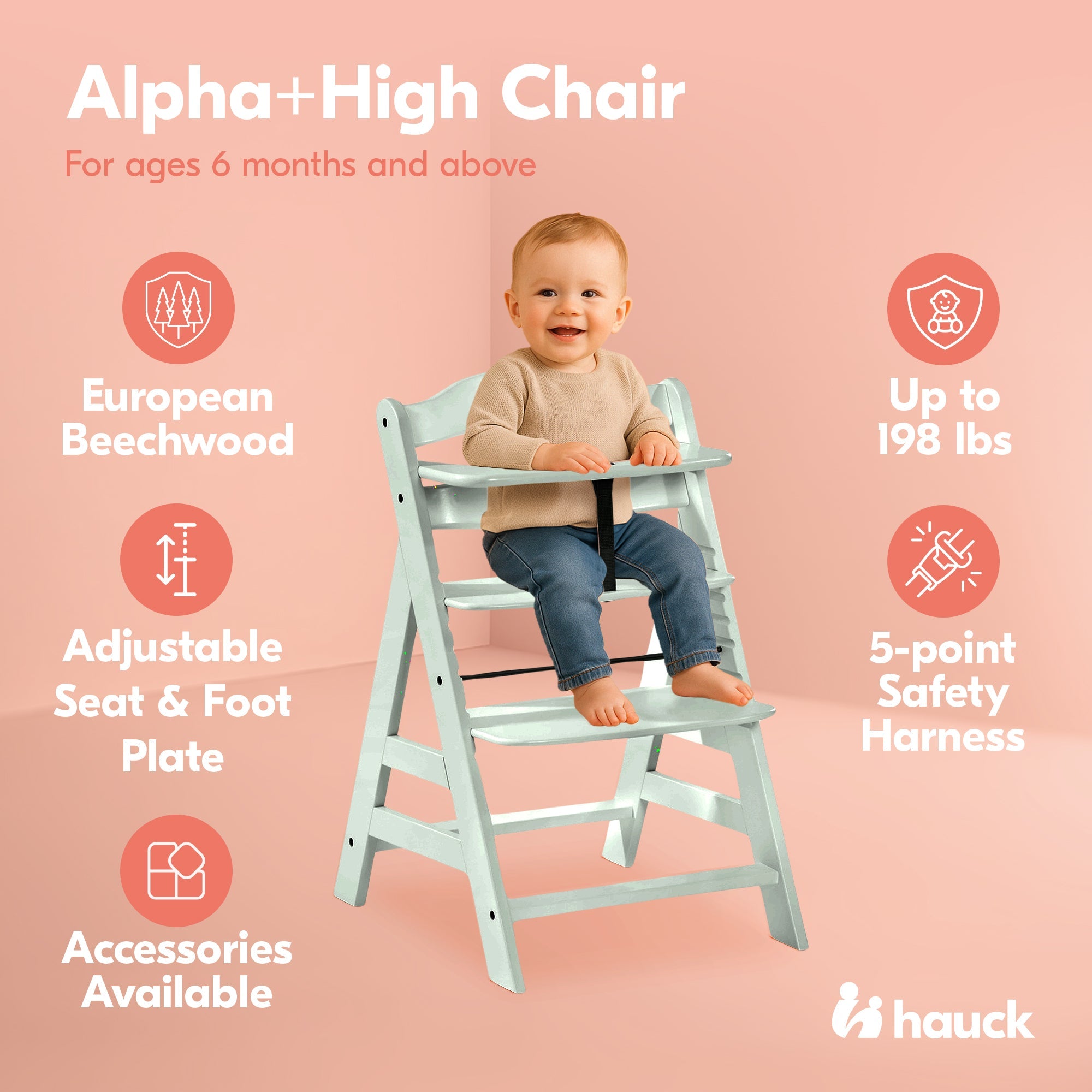 Only the best baby essentials are wanted when it comes to your child. Upgrade your baby's must-haves and include this Alpha+ Grow Along Wooden High Chair from hauck.