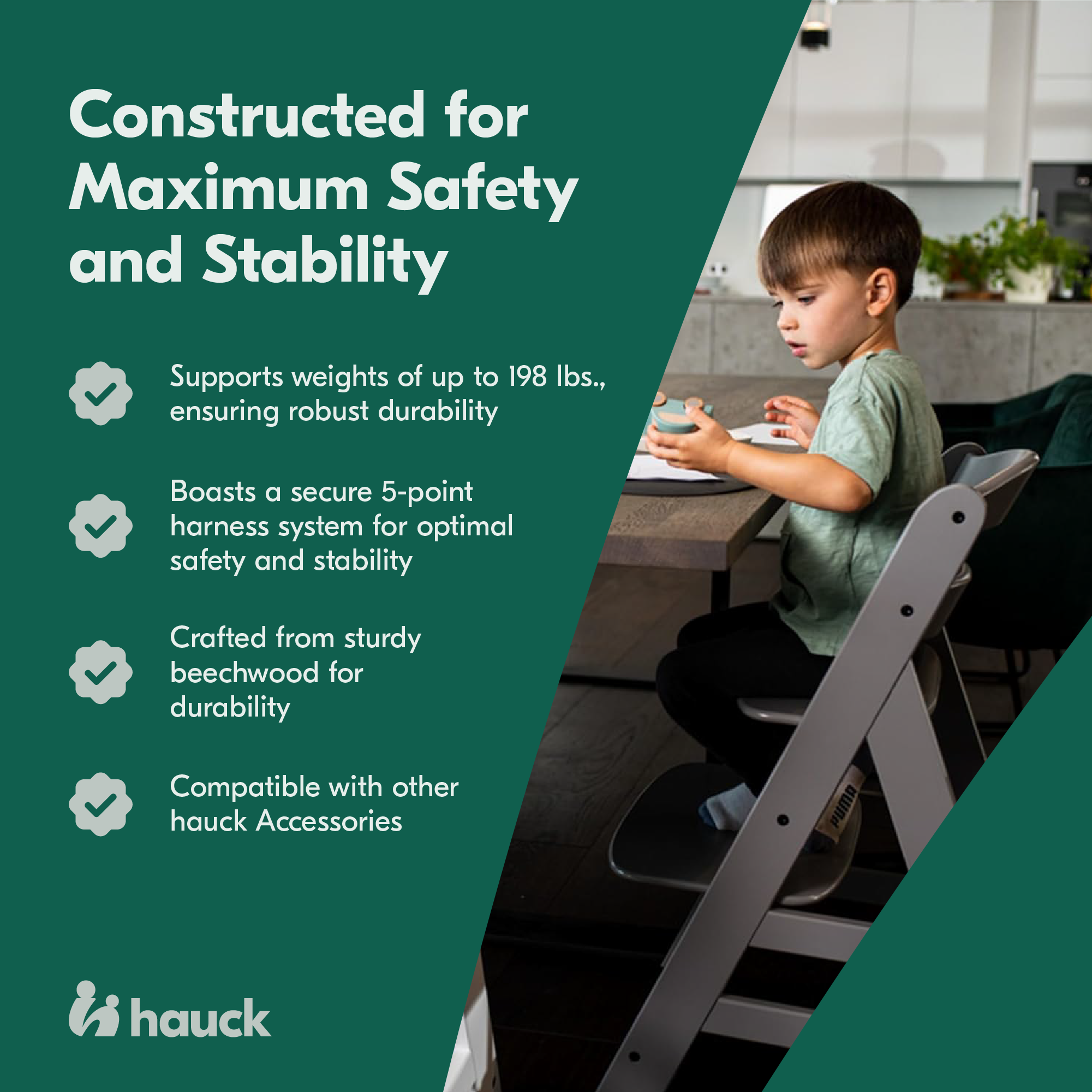 Elevate your child’s dining experience with the hauck Alpha+ Wooden High Chair with Tray. Suitable for children ages 6 months and up, this wooden high chair for baby is crafted from European beechwood and is designed to grow with your child. It features a removable tray and a washable seat cushion and has a maximum load capacity of 198 lbs. (90 kg). This high chair also offers an adjustable seat and foot plate along with a safety strap, a 5-point harness, and a removable safety bar for added convenience.
