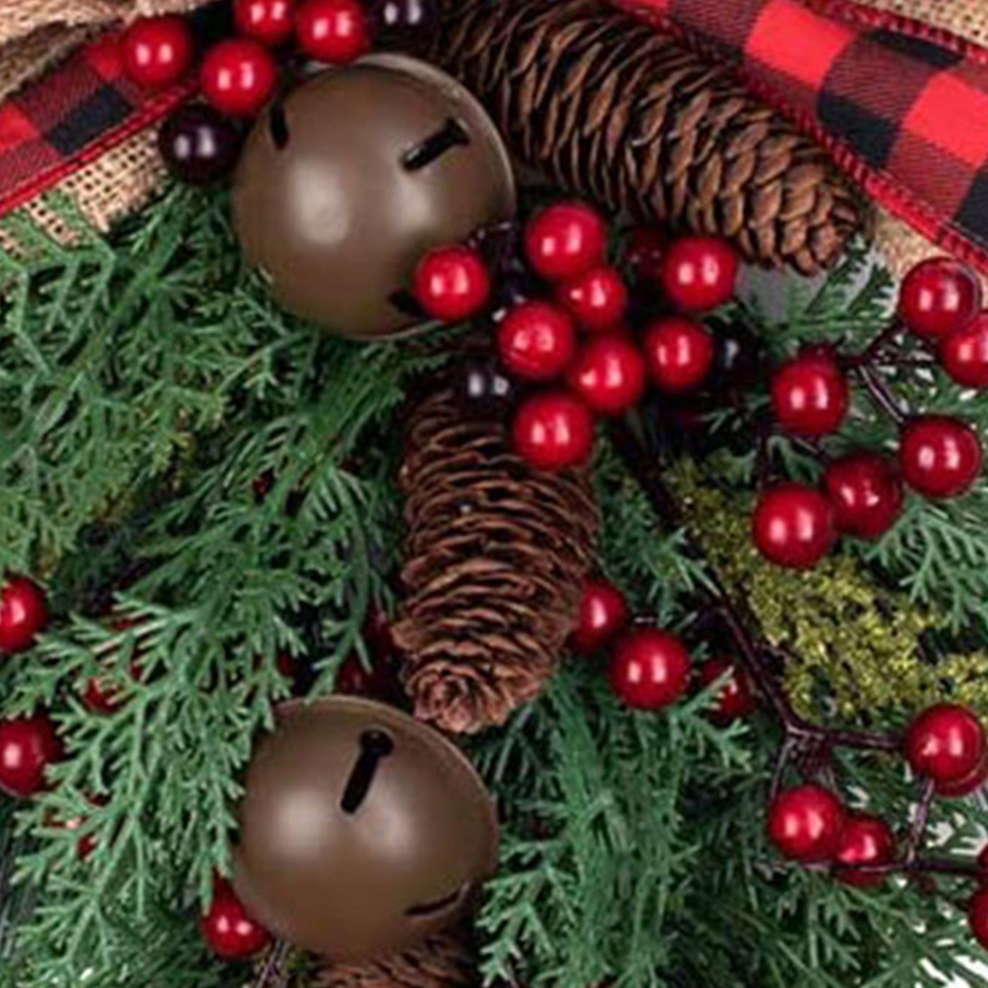 This festive holiday wreath is detailed with an assortment of mixed artificial greenery cypress, bristle tips, grass, faux red berries, real pinecones, rustic metal bells, and a holiday ribbon. The checkered ribbon around this Christmas wreath is weather-resistant for added stability and use in any weather.