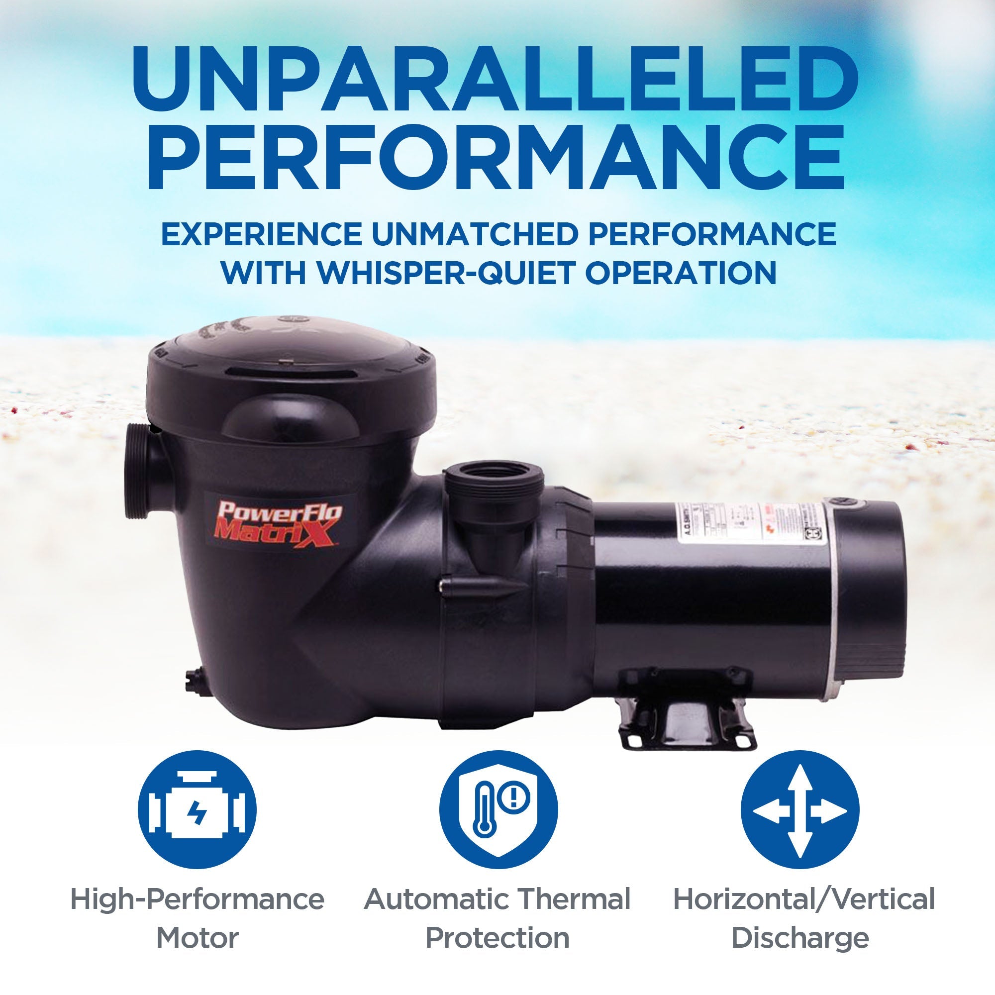 • Dive into a world of simplicity, durability, and uninterrupted pool pleasure with this PowerFlo Matrix Single Speed 1.5 HP Pool Pump
