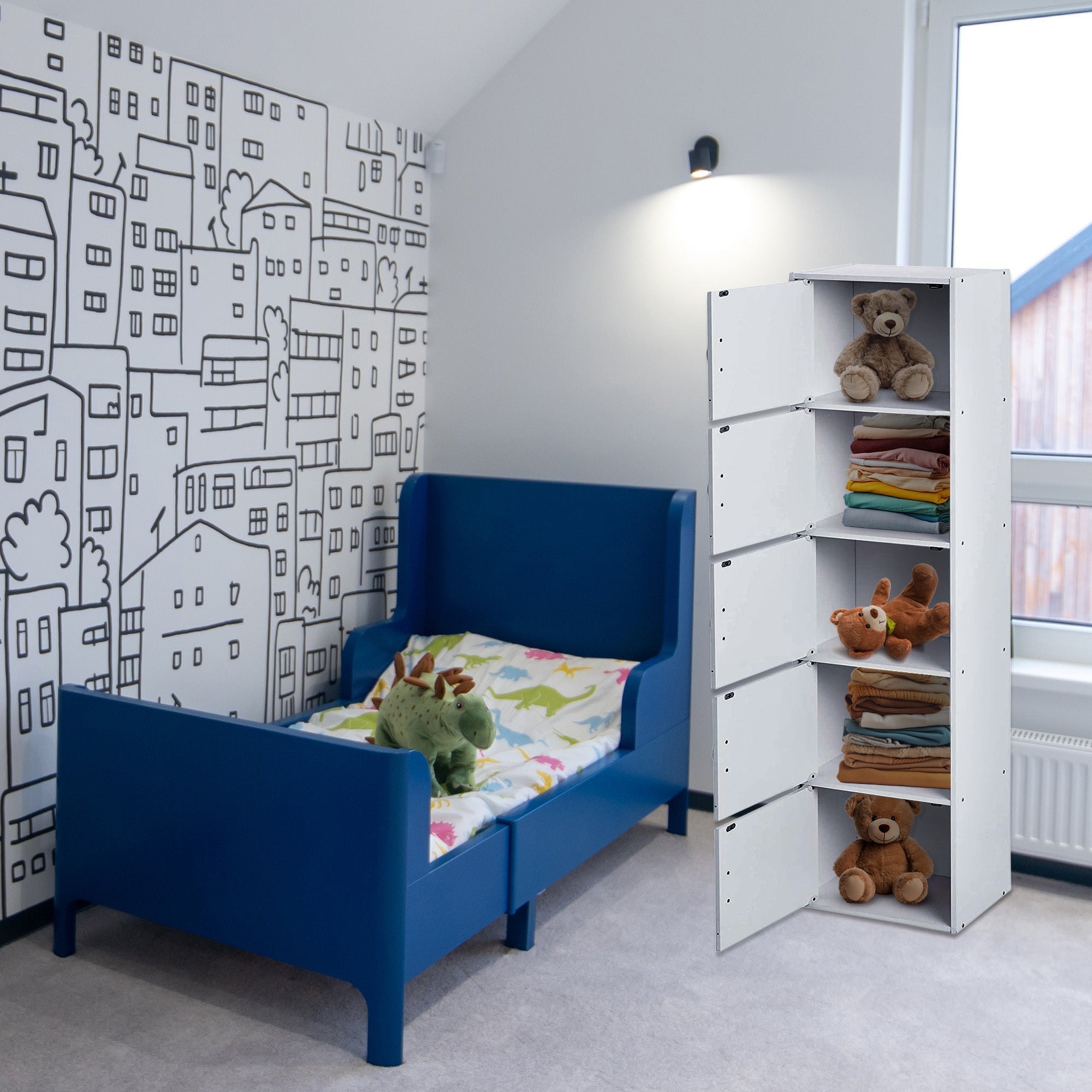 - Multi-purpose unit has 5 shelves with 5 doors to store books, clothes, toys, office supplies, and more