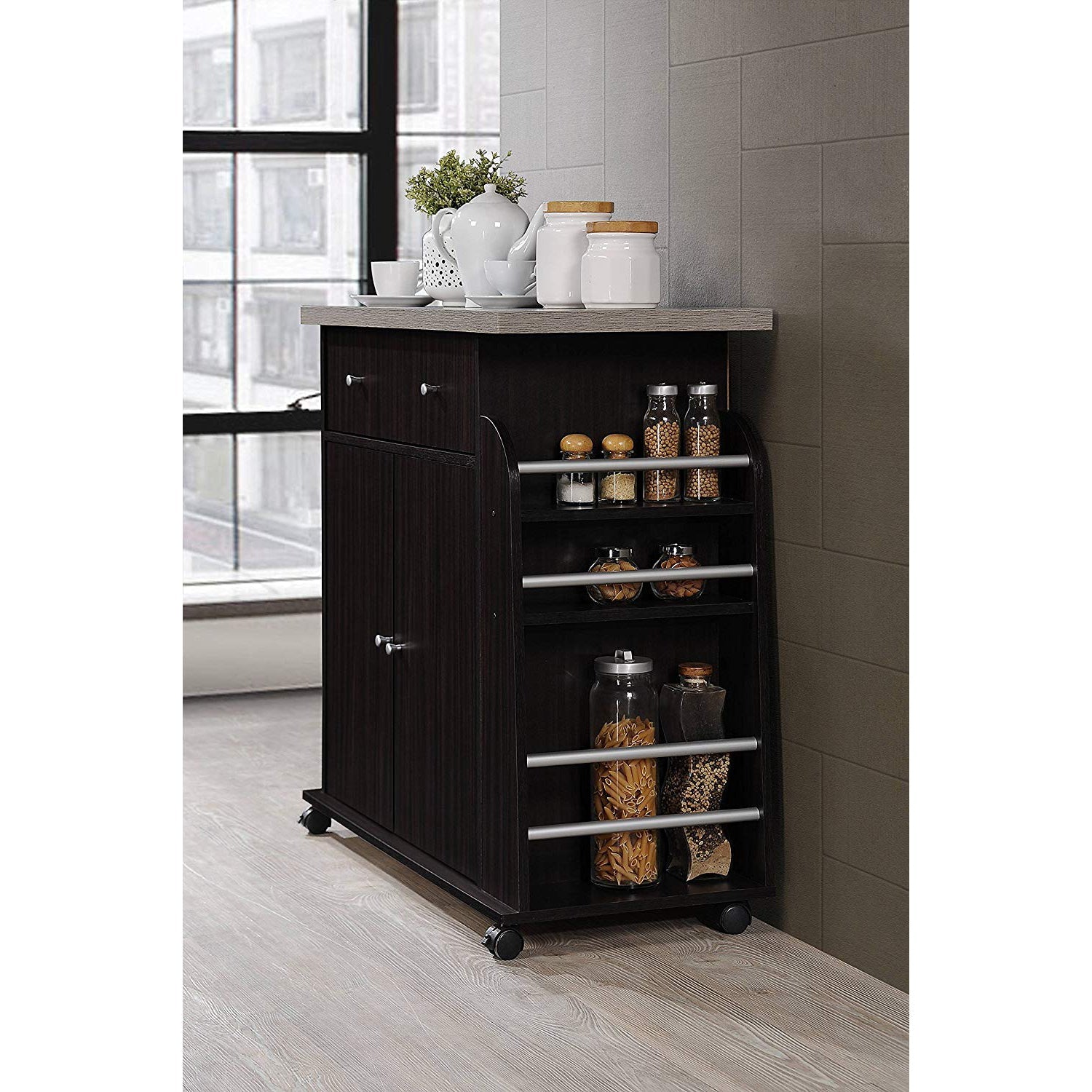 This kitchen island is available in multiple finishes and you can choose the 1 that blends with your existing interiors. It is made using high-quality compressed wood, which makes it sturdy and durable. It has a versatile design and is ideal for homes that have both traditional or cottage interiors. This kitchen cart features a towel rack, a spice rack, 1 spacious drawer, and an interior adjustable shelf. It also includes wheels for easy mobility around your kitchen. You can even use the top surface as a cutting board when needed.