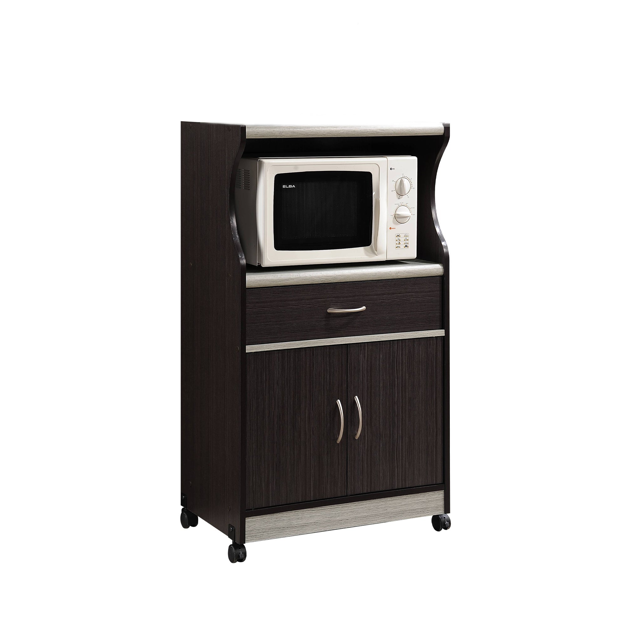 This stunning choco-grey microwave cart will make a functional yet stylish addition to your home or office. Made of wood, this cart ensures long-lasting strength and durability. Wheels with locking casters allow you to easily move the cart to find the perfect spot for usage and lock it into place. The pull-out drawer and cabinet space below give you all the storage you'll need for utensils and dinnerware. The top of the cart functions as an island for even more useable space. Whether in the interior of the double-door cabinet or on the island outside, you won't run low on storage space.