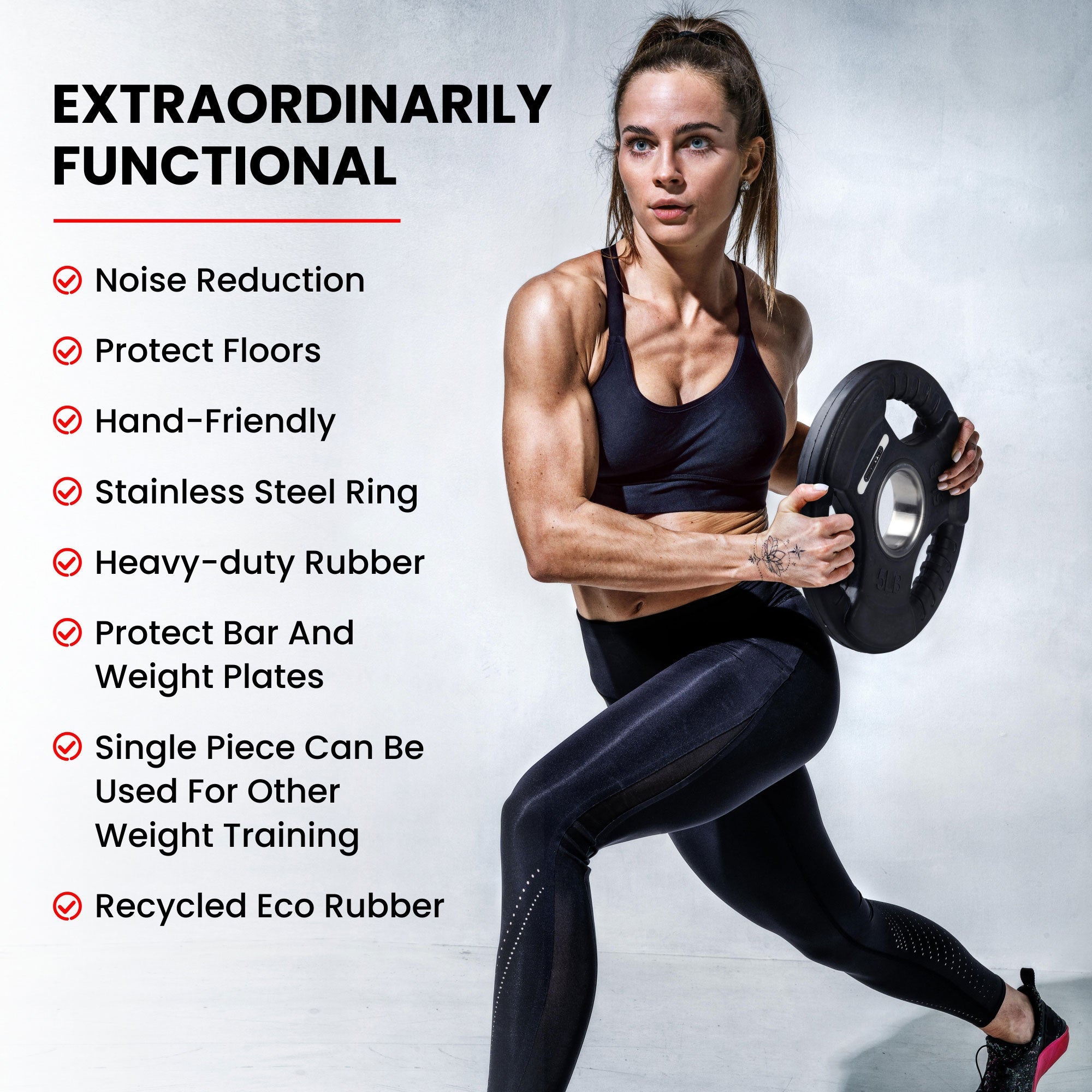These weight plates are expertly made from high-density rubber and have unmatched durability, allowing them to withstand even the most strenuous exercises and repeated drops. These plates safeguard your flooring from harm and your strength bar from deterioration with the sturdy stainless steel inserts, ensuring long-lasting use. Featuring 3 ergonomic grips inside the edges, you can use it for more than just barbell or curl bar workouts. With a comfortable handle, you can easily hold the weight while completing sit-ups, executing lunges, or doing other full-body exercises.