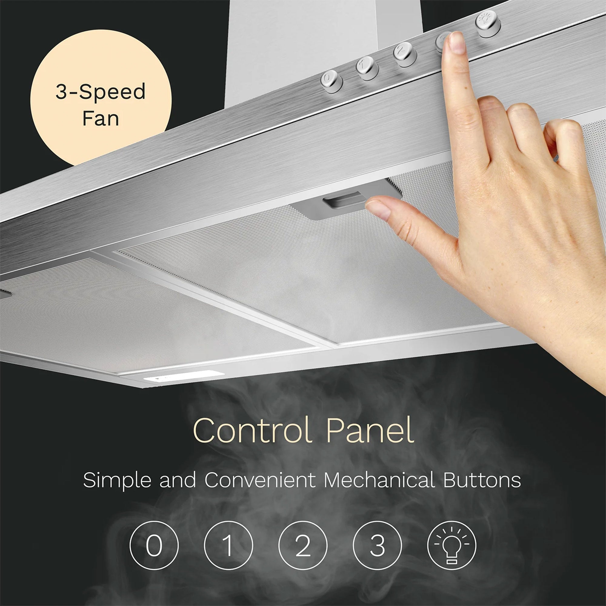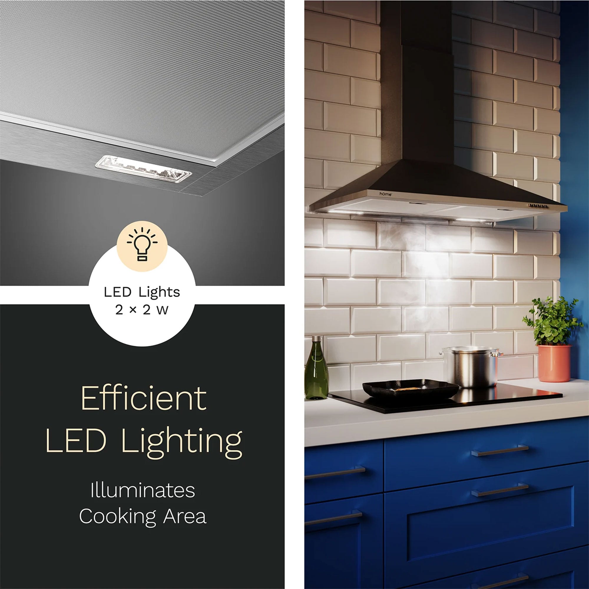 • Sturdy rangehood complements kitchen interior designs with 2 bright LED lights for convenience when cooking at night