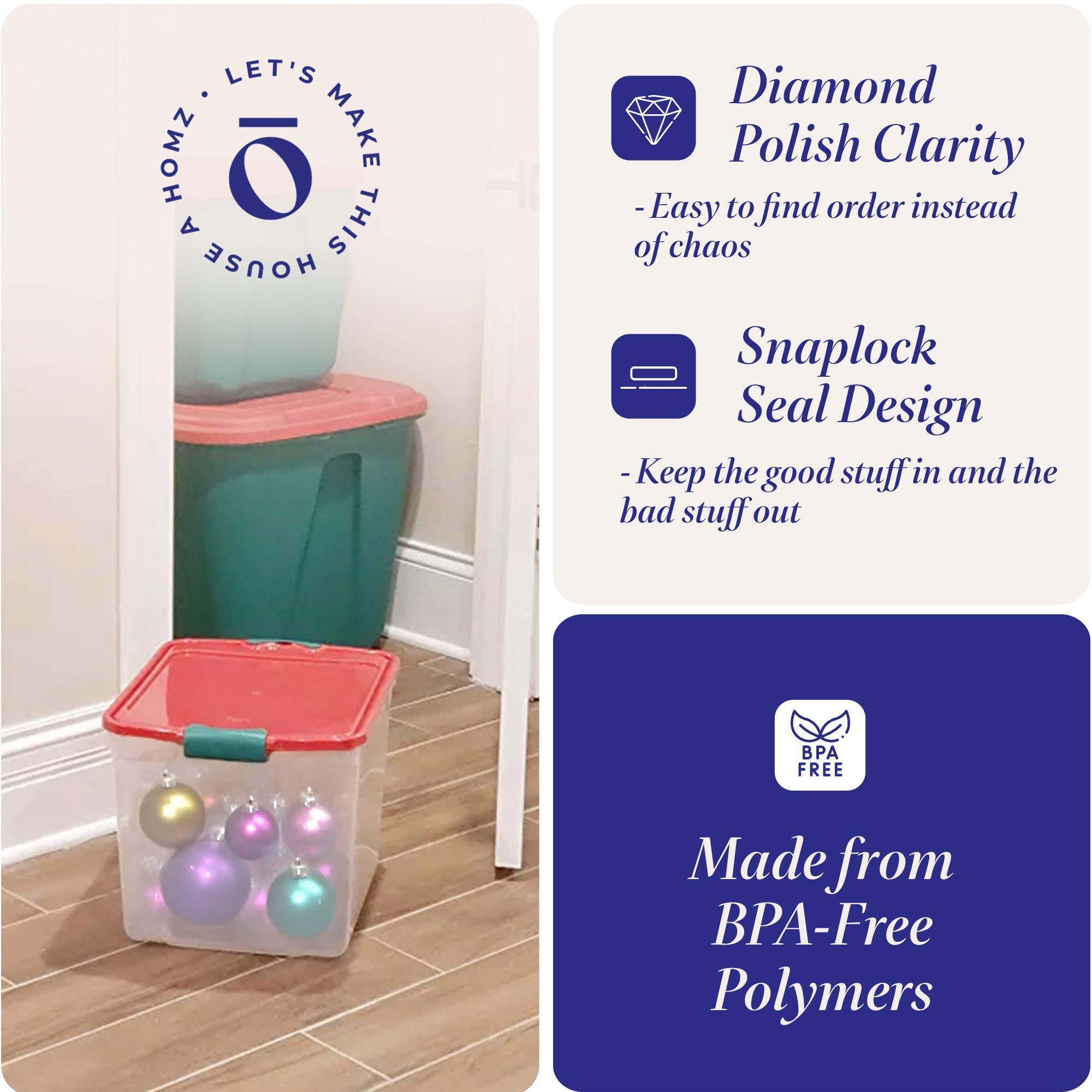 Celebrate with a clean slate by keeping ornaments organized this yuletide season with the HOMZ 31 Quart Holiday Clear Plastic Storage Container with Latching Handles. With these storage containers, you can easily make homes spotless by having your favorite holiday decorations, clothing, gift wraps, and more in one storage.
