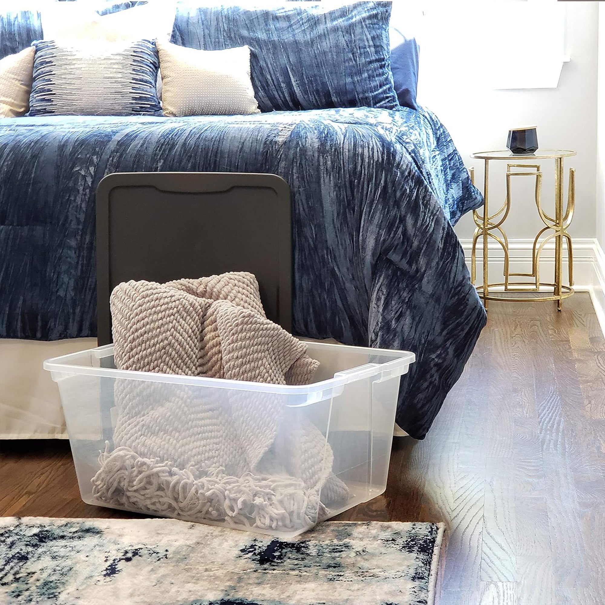 This clear storage bin with lid offers 56 quarts of internal space providing ample room for small to larges items. Featuring secure Snaplock lids, these storage containers offer a robust safeguard, guaranteeing the confinement of your personal items in a dry and secure environment, effectively shielding them from dust and debris. The clear design makes these containers even better. You can easily see what's inside without opening them, which saves time looking for things. This feature also helps you find items quickly and keeps your storage organized.