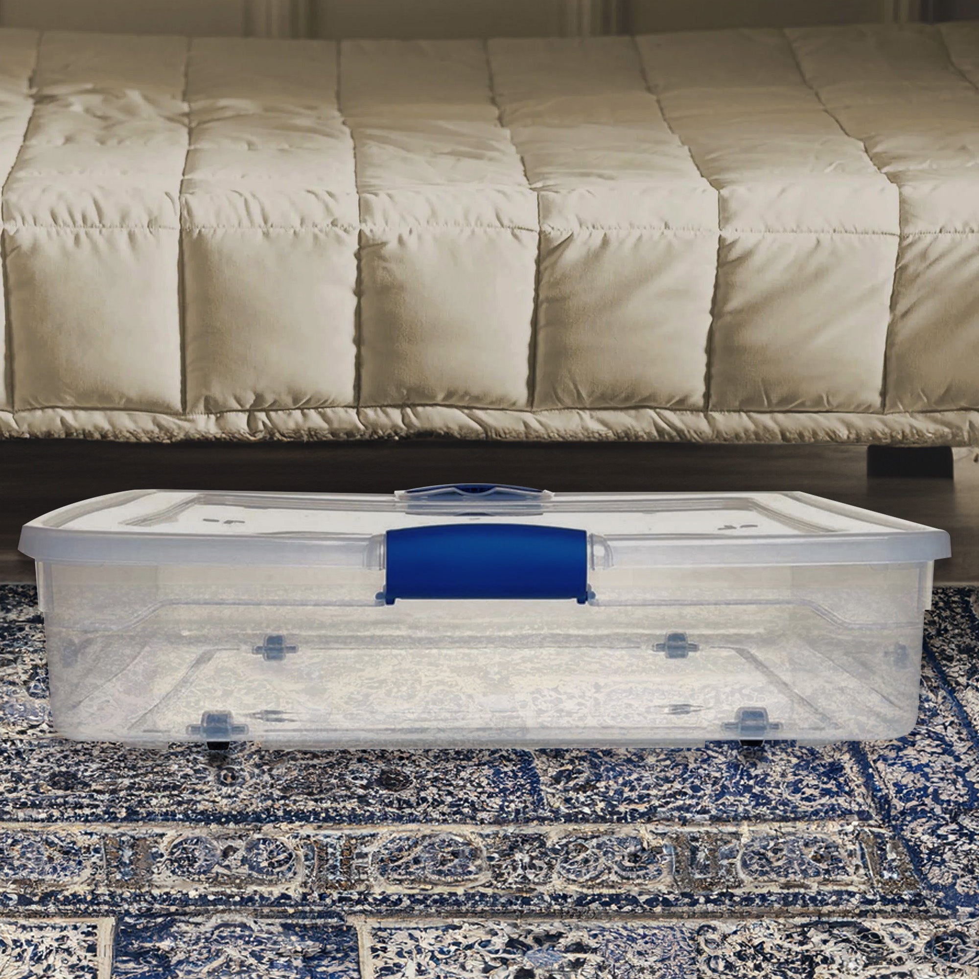 Easily take your tote on the go by using the ergonomic carry handles. The modular design optimizes storage space, allowing you to stack and nest each bin. Store under your full and queen beds for out-of-the-way storage space, and these totes are designed with easy-glide wheels on the bottom for easy sliding.