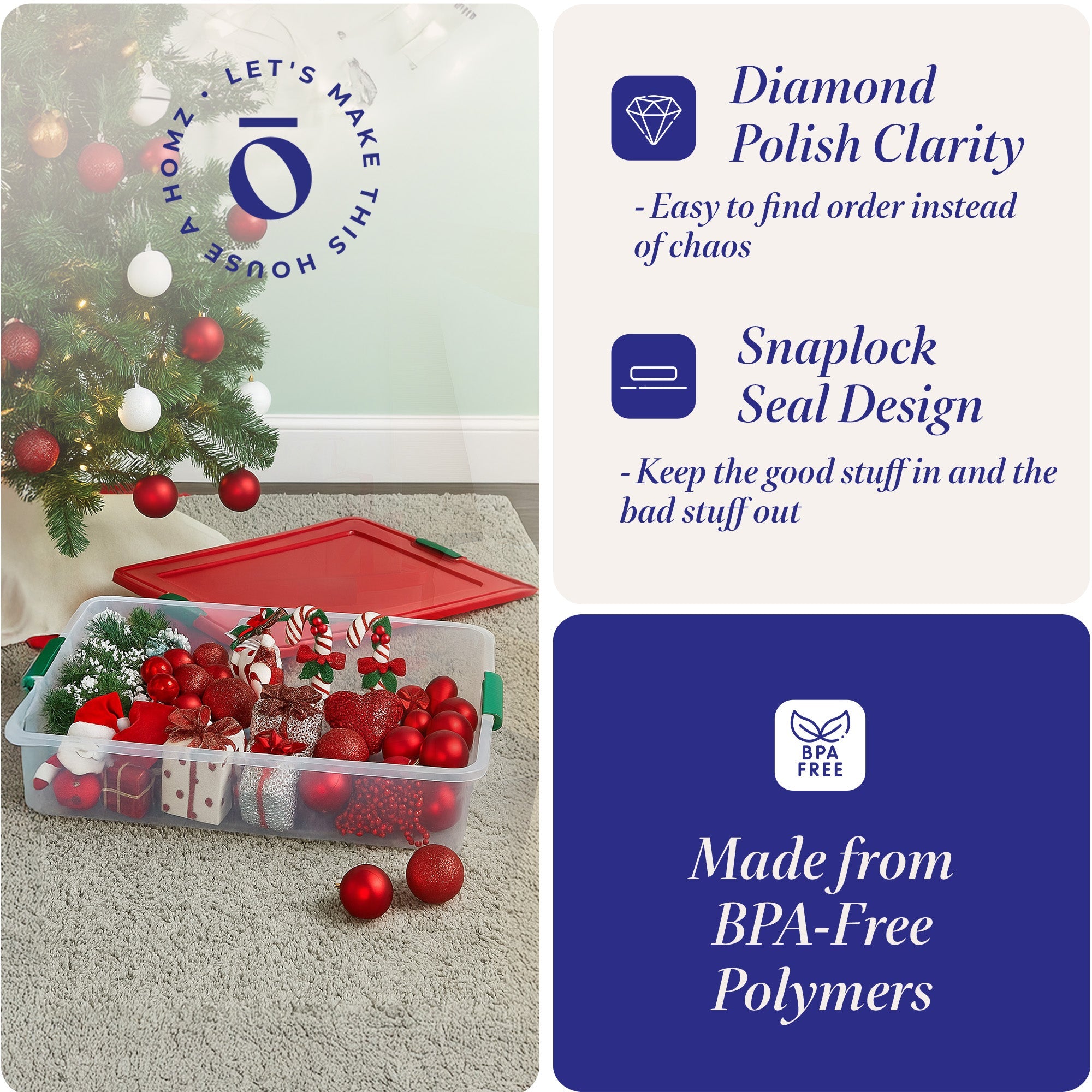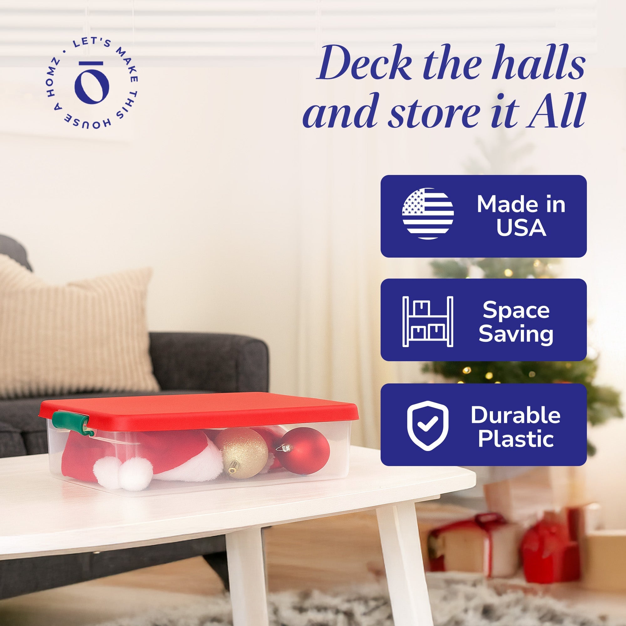 Keep the clutter away all year round with the 4-Pack of HOMZ 60-Quart Latching Holiday Underbed Storage Containers. With these totes, you can easily make homes spotless by having your favorite shoes, seasonal clothing, bedding, gift wrap, crafts, toys, and more neatly stored away.