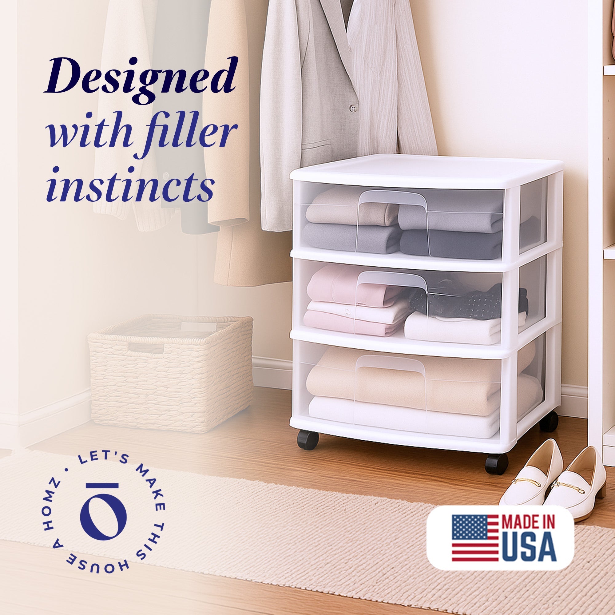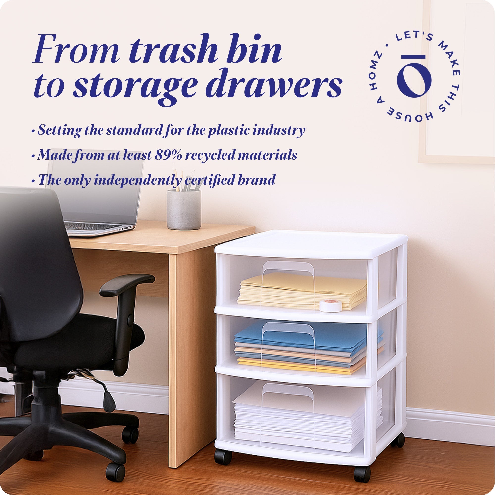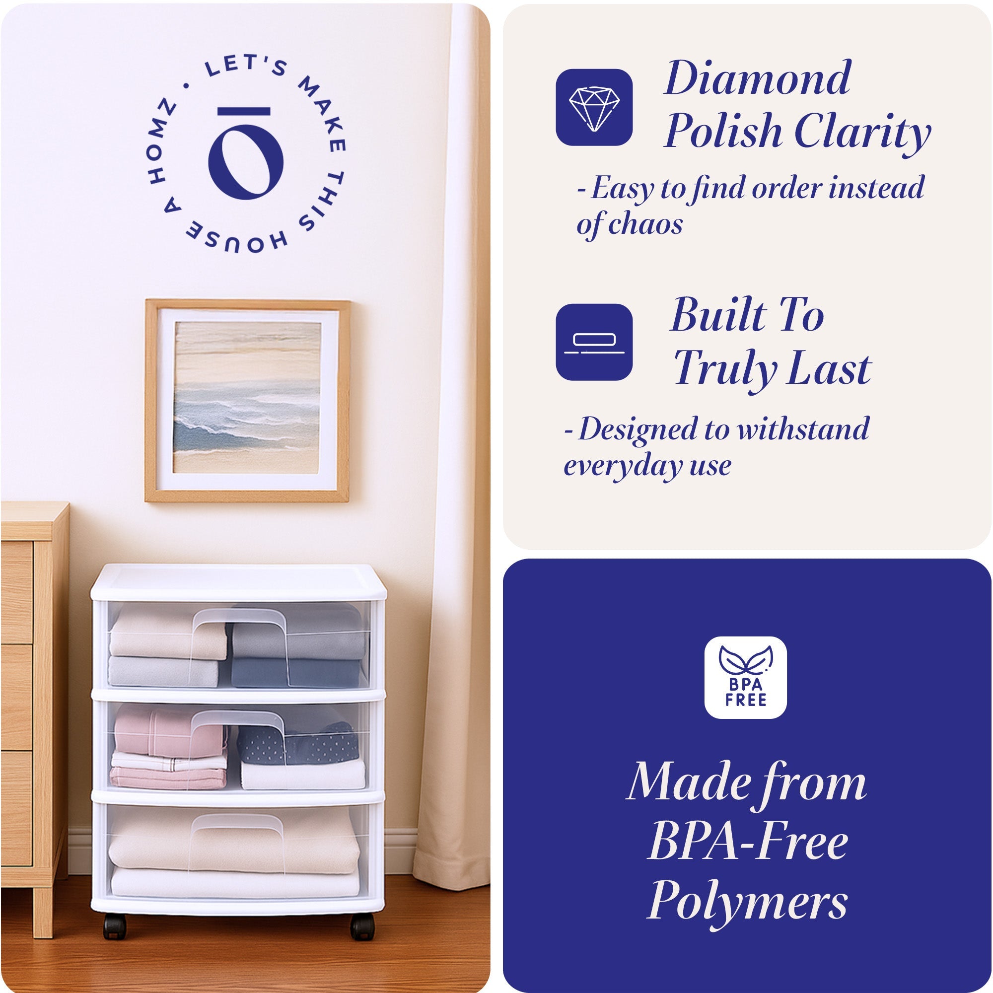 Homz Plastic 3 Clear Drawer Small Rolling Storage Container Tower, White Frame