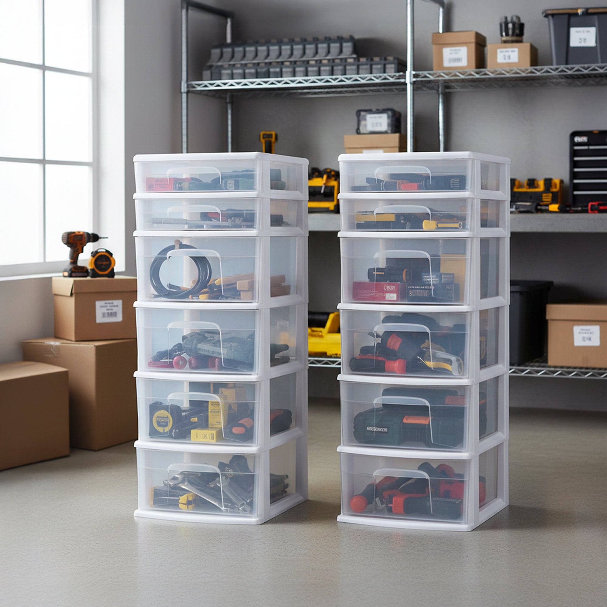 Homz Plastic 6 Clear Drawer Medium Home Storage Container Tower, White (2 Pack)