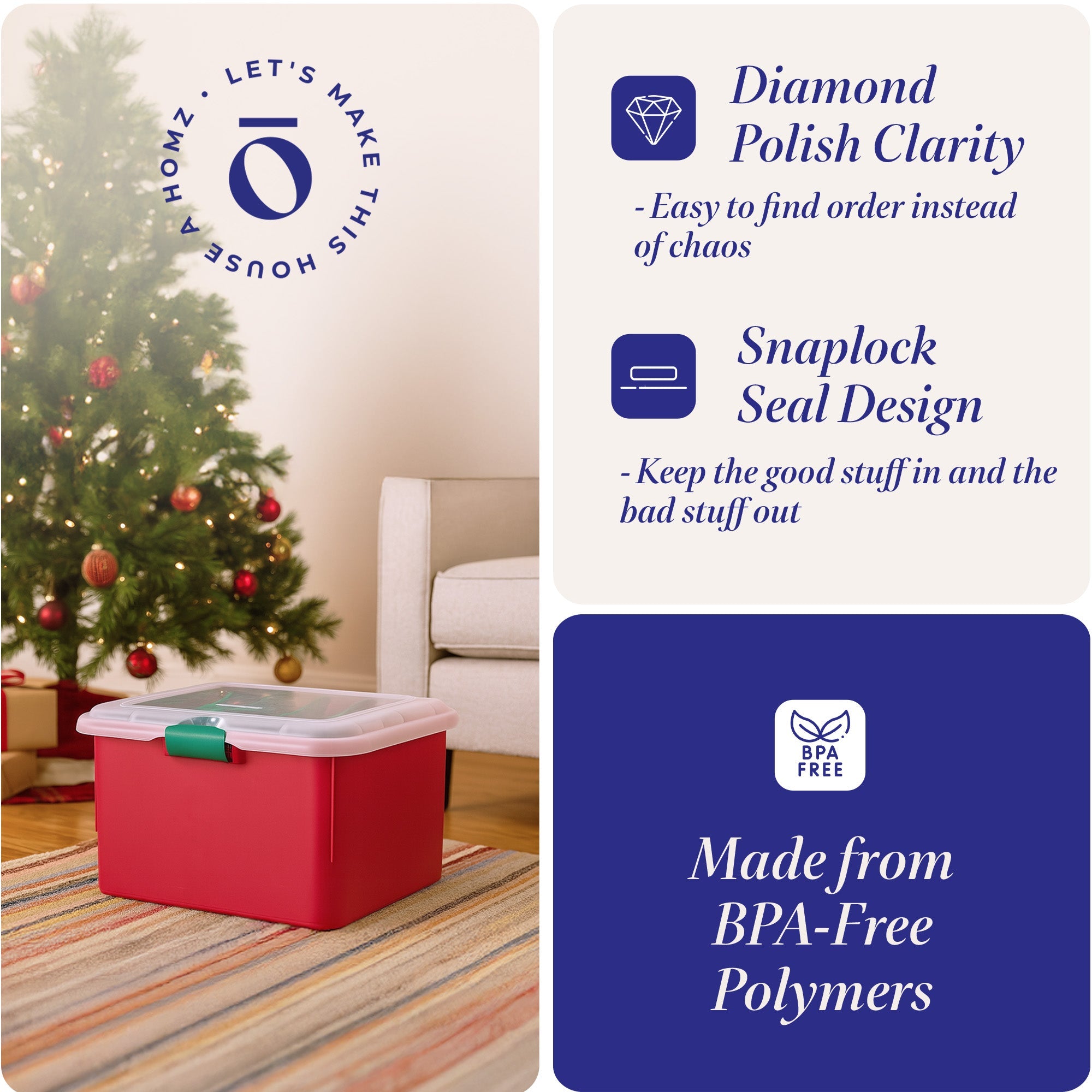 - Easy to stack with other holiday storage containers and bins