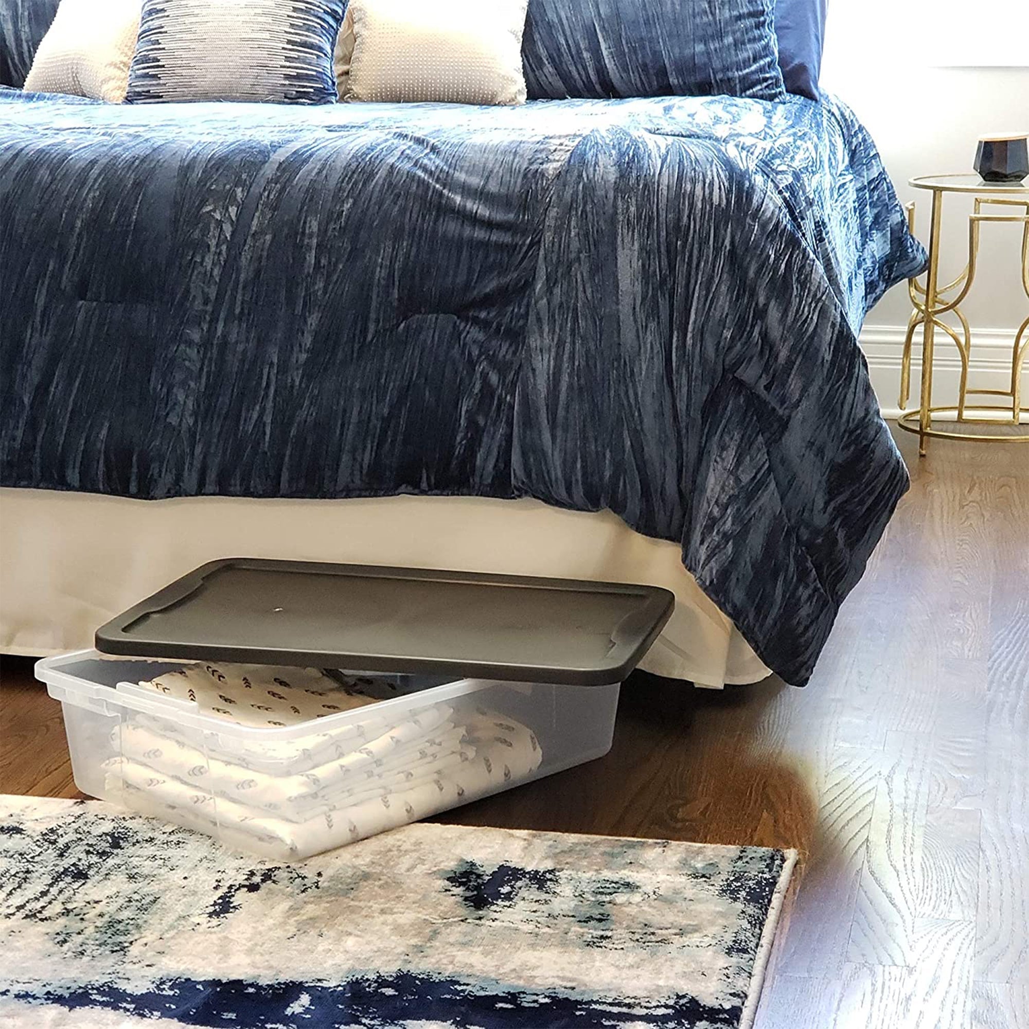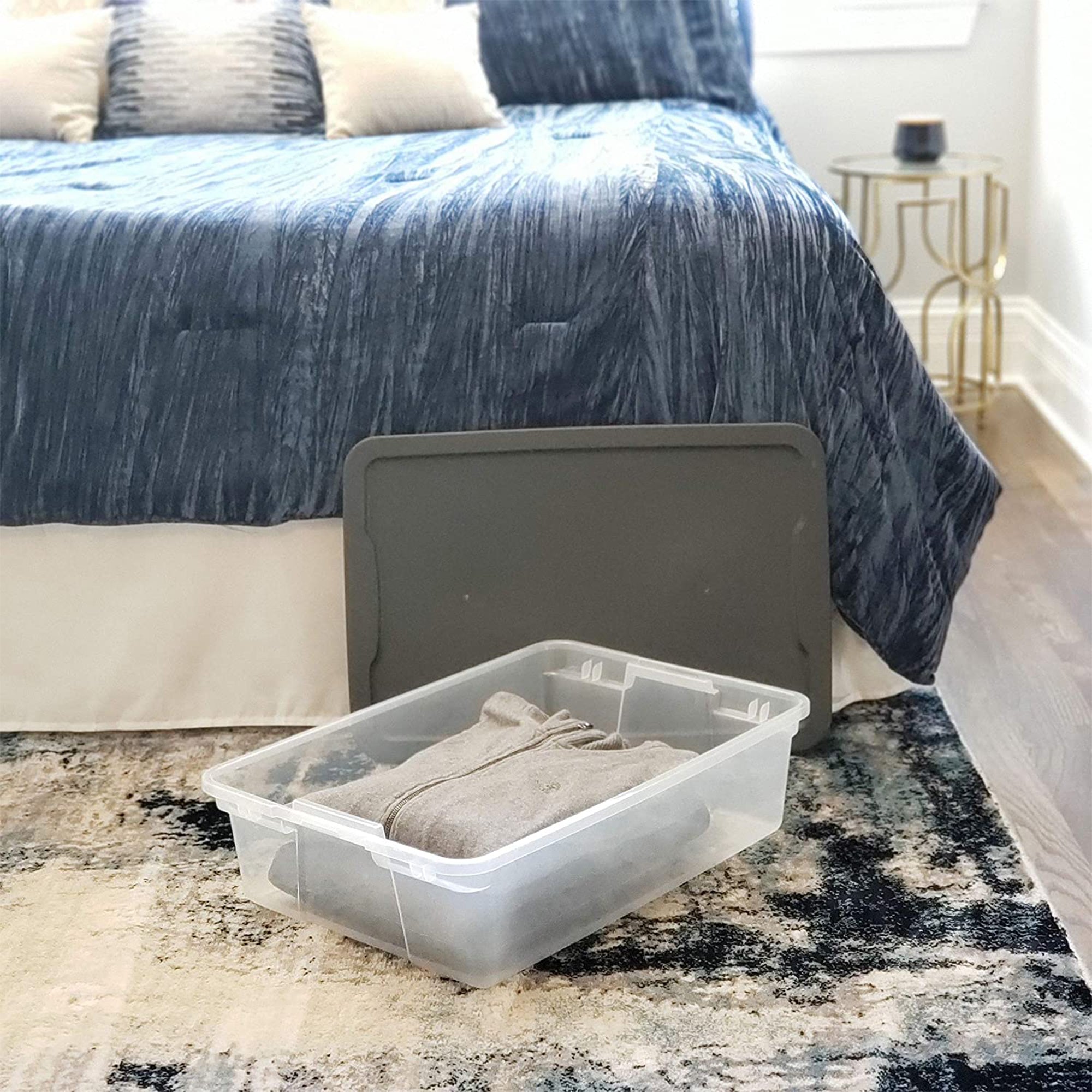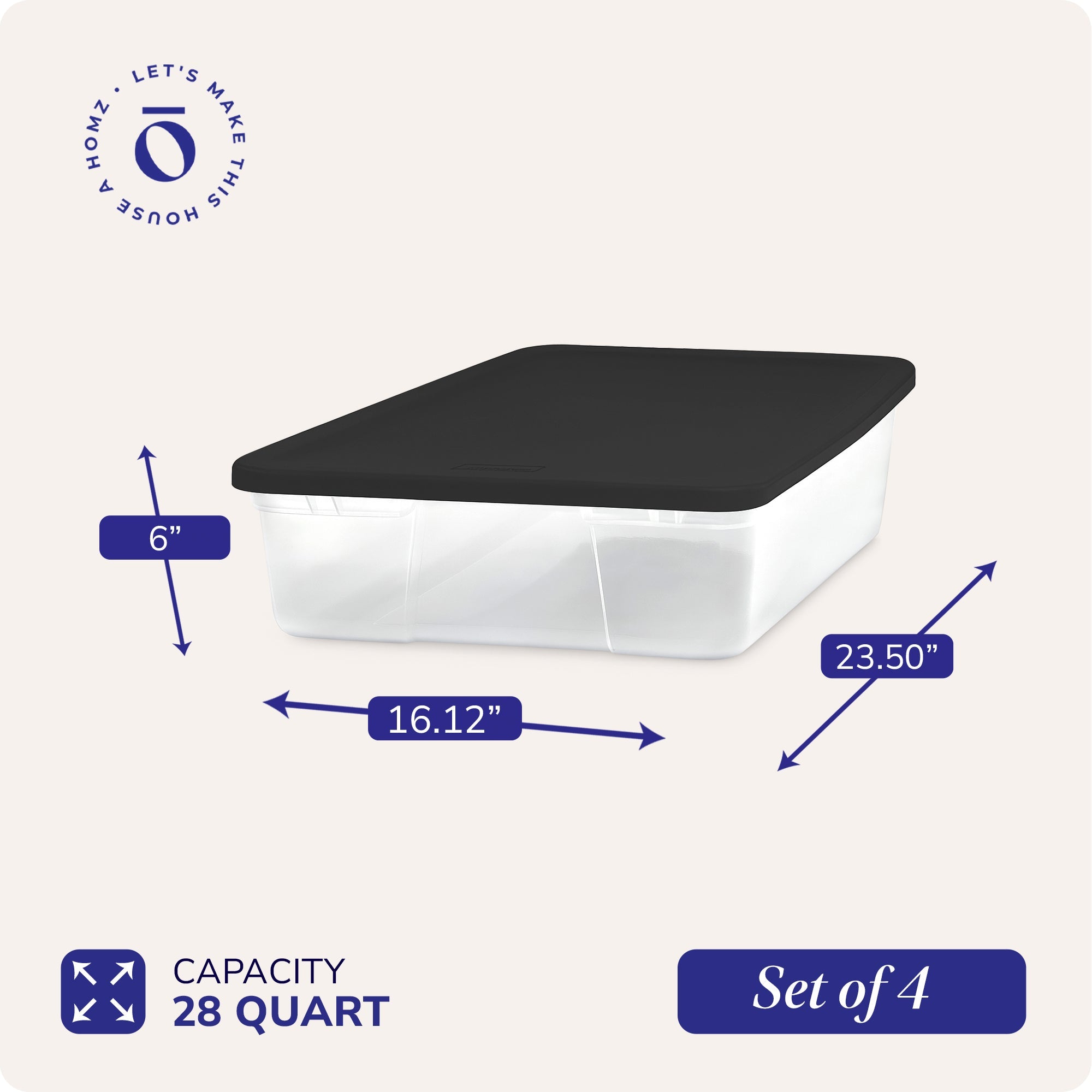 Tidy up the clutter underneath your bed and neatly store away your things with the 4-pack of 28-Quart Storage Containers from Homz. These under-bed clear storage containers are a great way to organize and provide additional storage space where you least expect it.