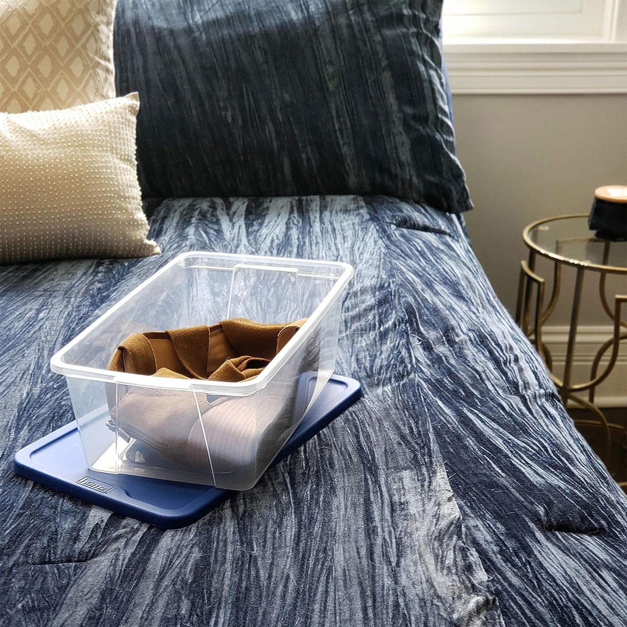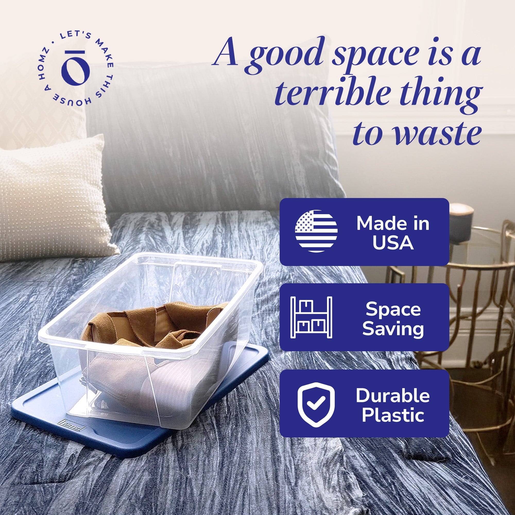 Profoundly indented lids and a modular design enable secure stacking, optimizing vertical storage capacity in your kitchen, bathroom, and closet. Bins fit snugly when stored away, promoting efficient organization. Ideal for bathroom, kitchen, garage, dorm, and off-season storage, these storage containers are designed for extended and enduring utility. Each bin is constructed of robust, high-strength plastic with dimensions of 8.25 inches long, 16.63 inches wide, and 4.75 inches tall. With the 4.75-inch height, the clear organizer box is great for under-bed storage, too!