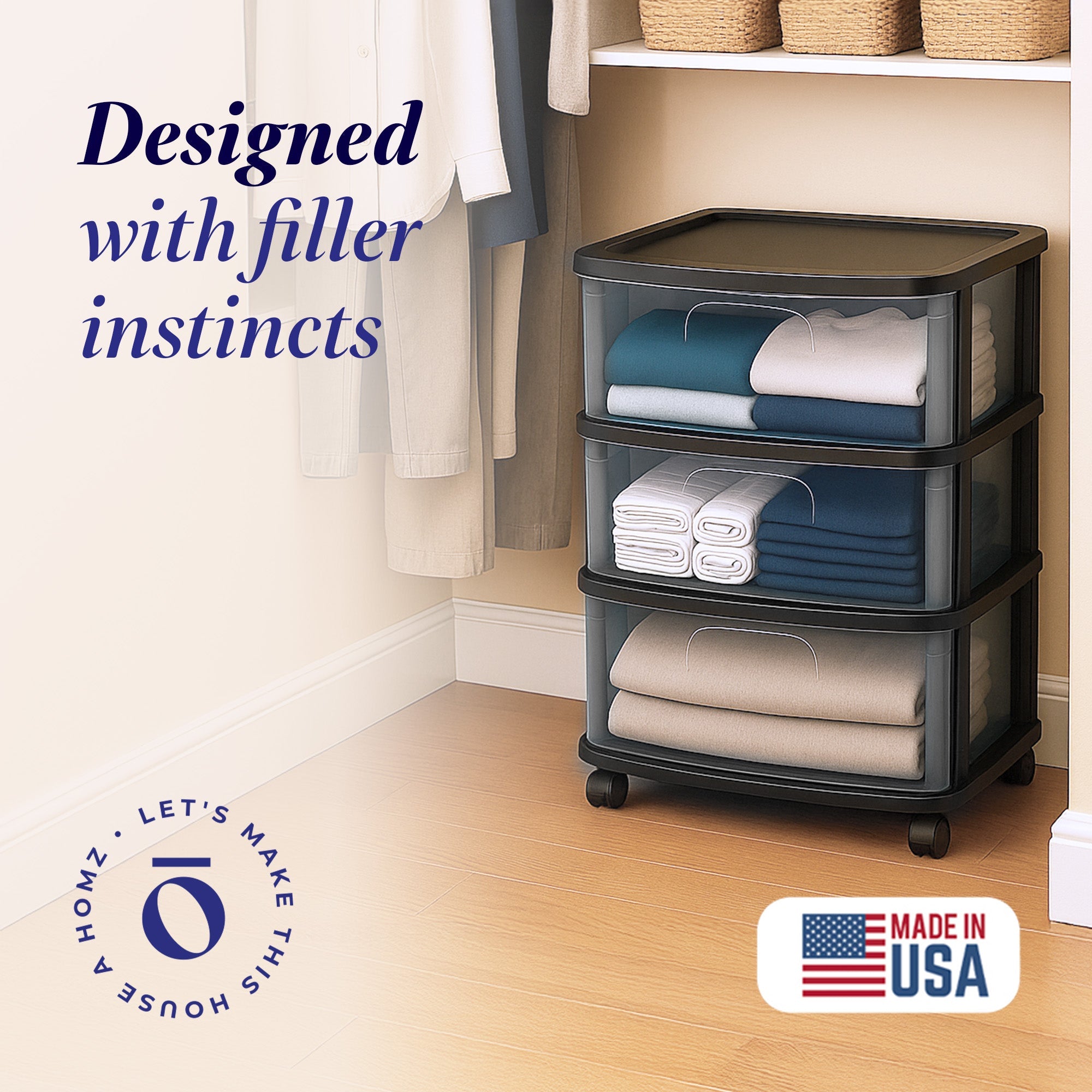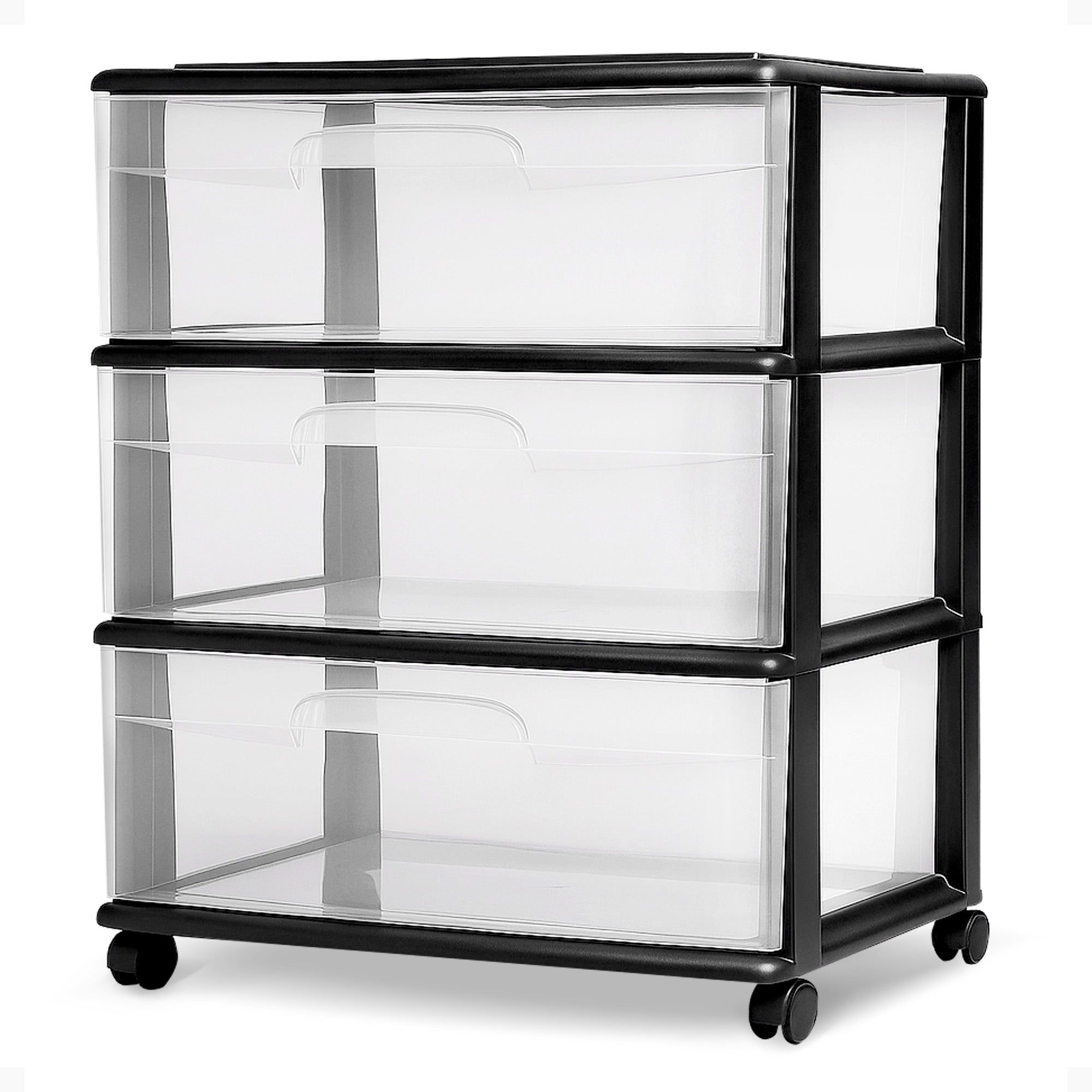 Homz Tall Solid Plastic 3 Drawer Medium Storage Cart with Caster Wheels, Black