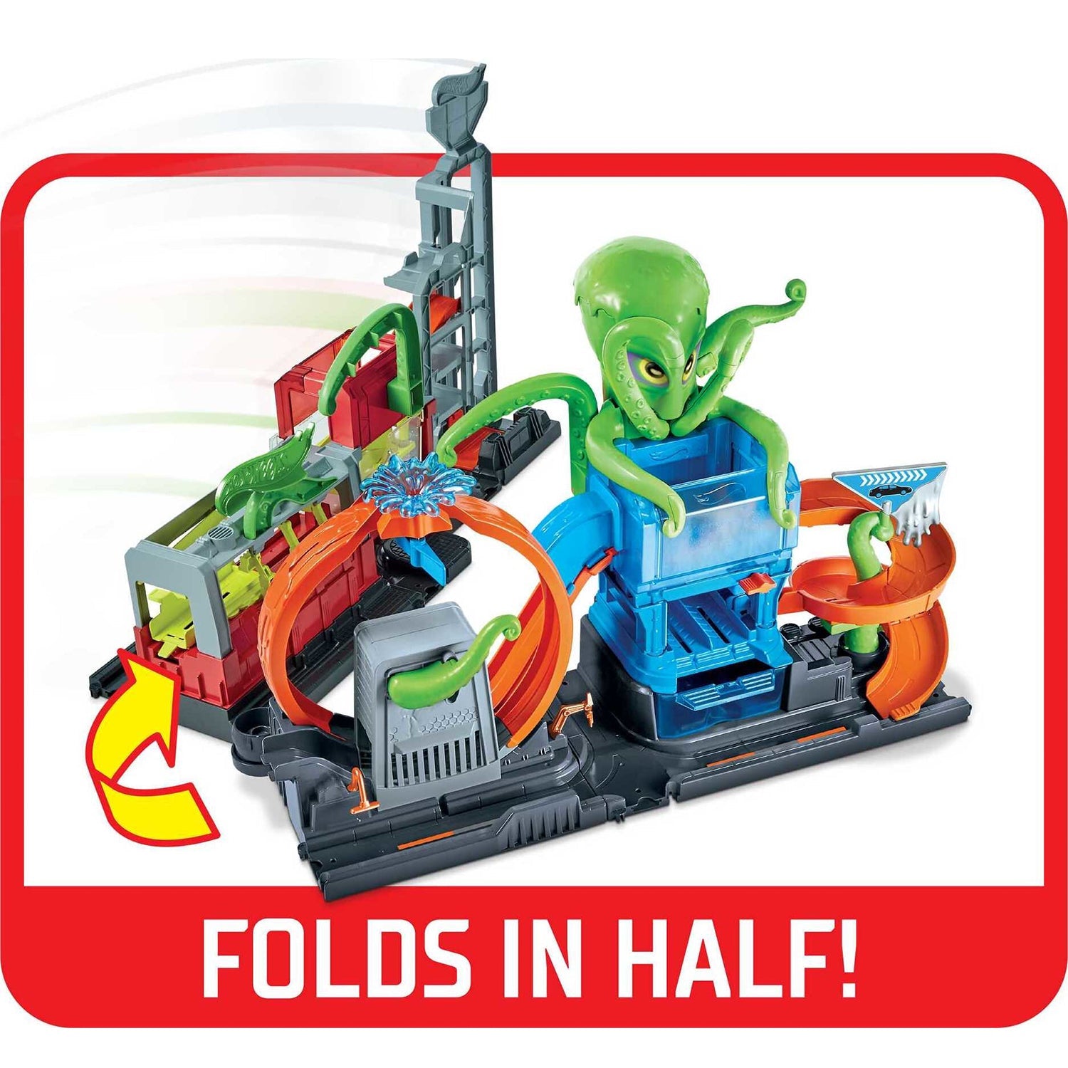 - Includes 1 car, track loops and pieces, water tanks, and octopus accessories; for ages 4 years and up