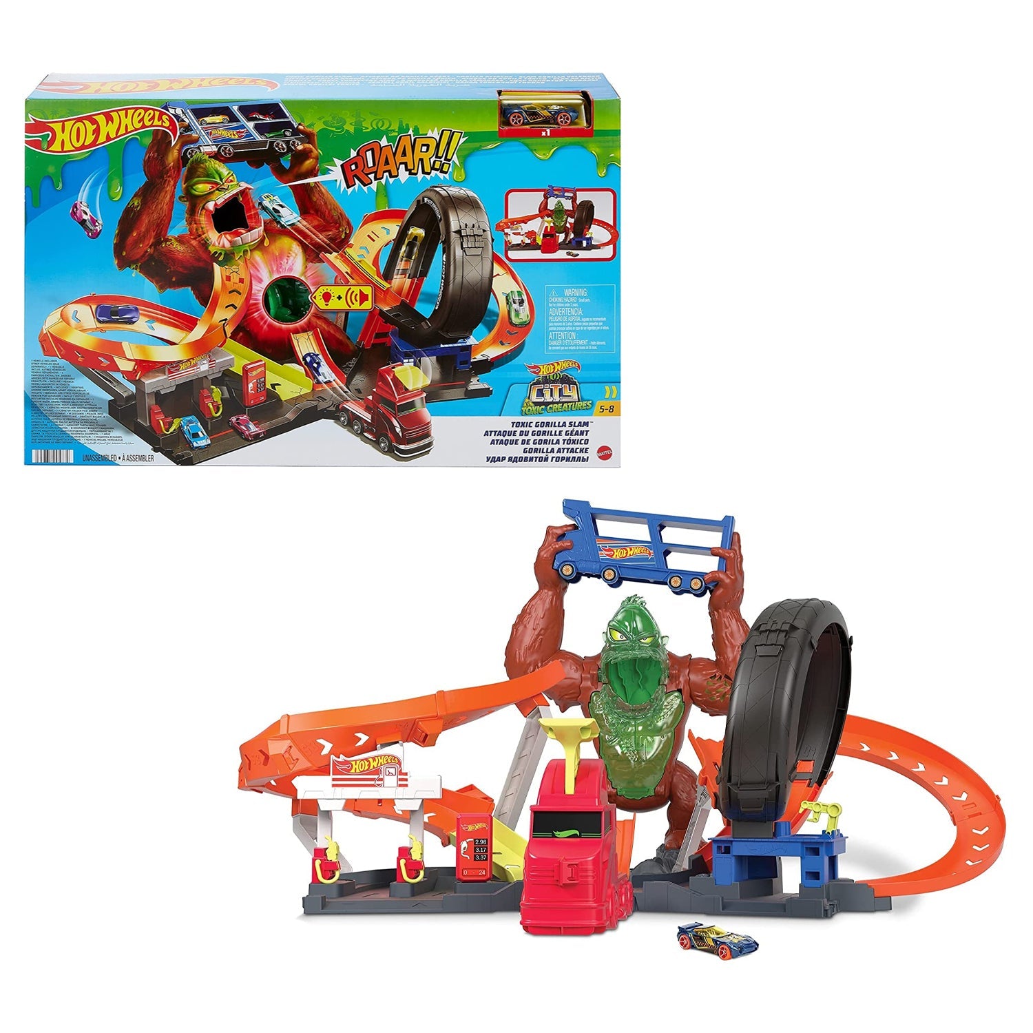 Conquer your giant nemesis and save the gas station from total destruction in the Toxic Gorilla Slam Playset from Hot Wheels.