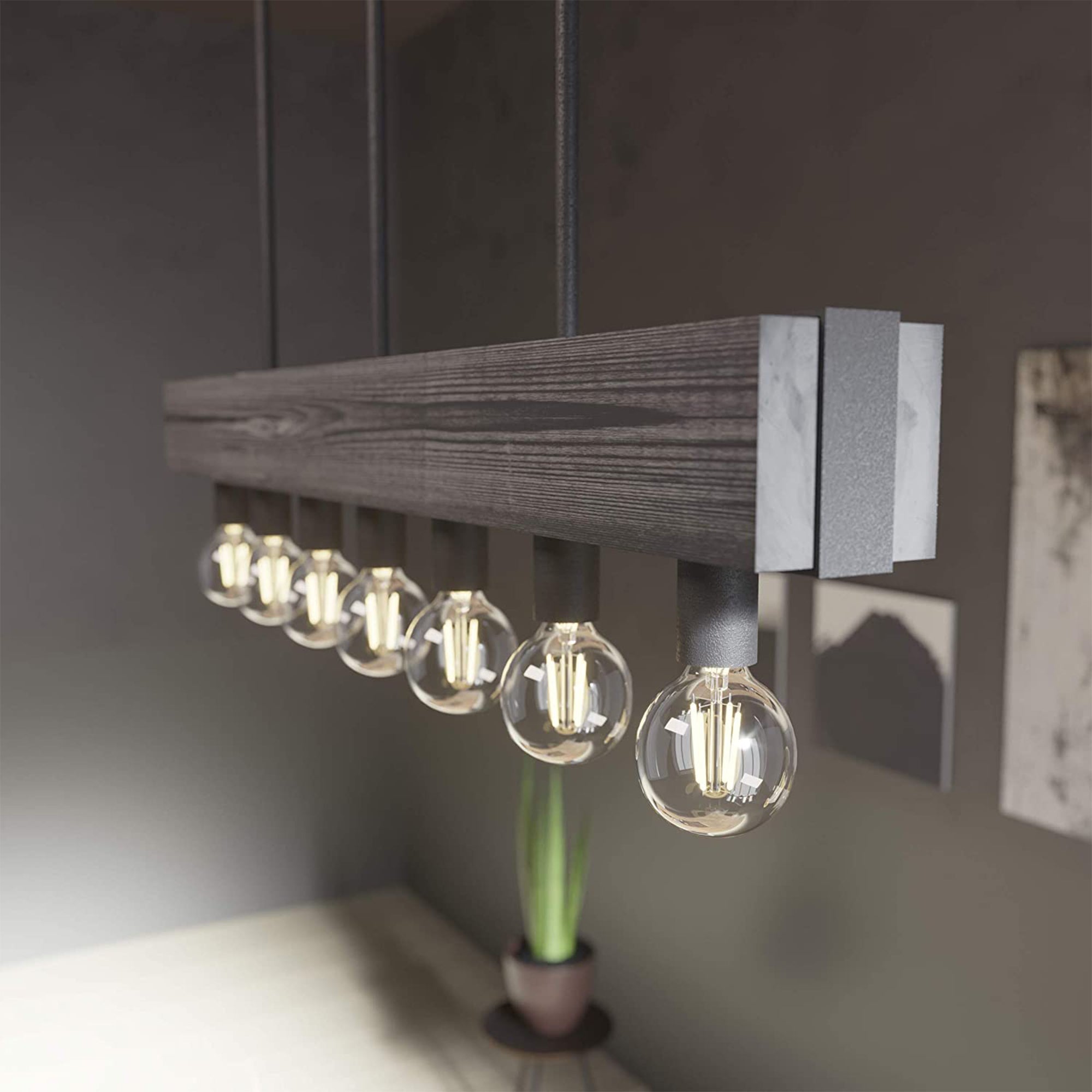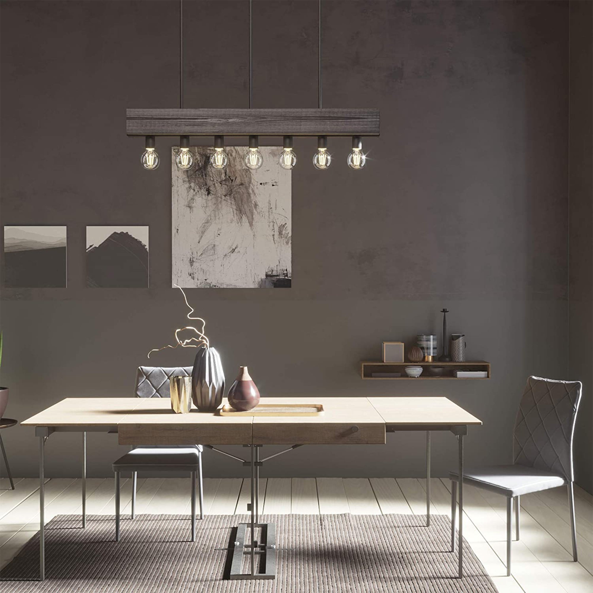 This farmhouse-style light fixture is ideal for adding focused light above kitchen islands, dining room tables, or entryways without the need for overhead lighting. With stylish wooden construction and natural iron details, this rustic light brings a modern industrial design to complement your home. This hanging light can be mounted in a variety of heights between 13.5 to 61.5 inches and is rated for use in dry locations in your home. Easy to install, this rustic light comes with detailed instructions and clearly marked hardware for minimal assembly. The 7 light fixture is dimmable with a dimmer switch (not included) to bring the ideal amount of light to your space during the day or at night.