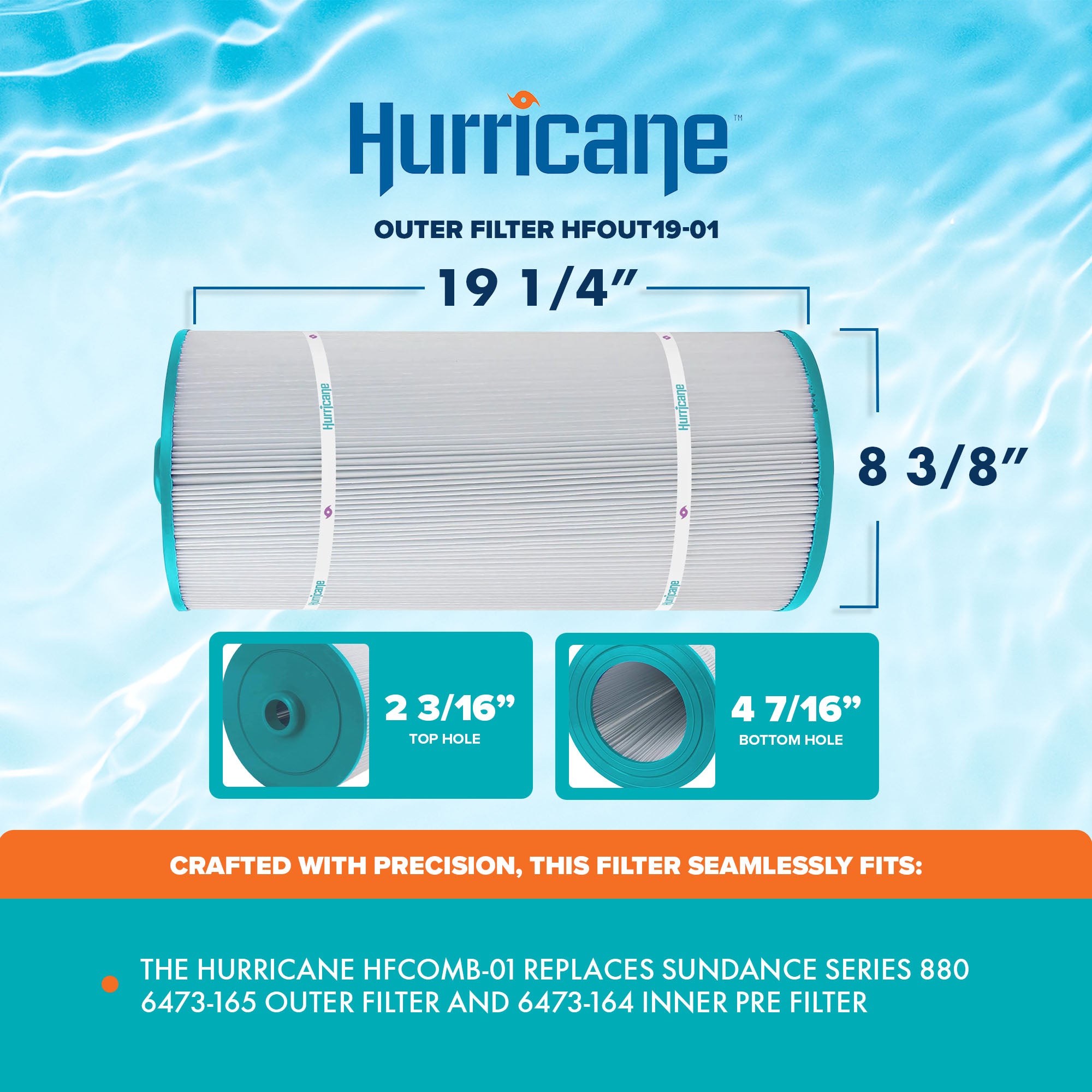 Dive into the realm of pristine waters with the Hurricane HFCOMB-01 Advanced Cartridge Filter Set, where unparalleled cleanliness awaits. Crafted with meticulous precision, this filter guarantees seamless compatibility with a range of models including Sundance Series 880 6473-165 Outer Filter and 6473-164 Inner Pre Filter, and other compatible models. With dimensions measuring 19.13 inches in length, an outer diameter of 8.38 inches, the top closed with a strong handle, and the bottom hole being 4.44 inch MPT threaded, achieving an ideal fit with this filter cartridge is effortless, measure your current filter for a flawless match.