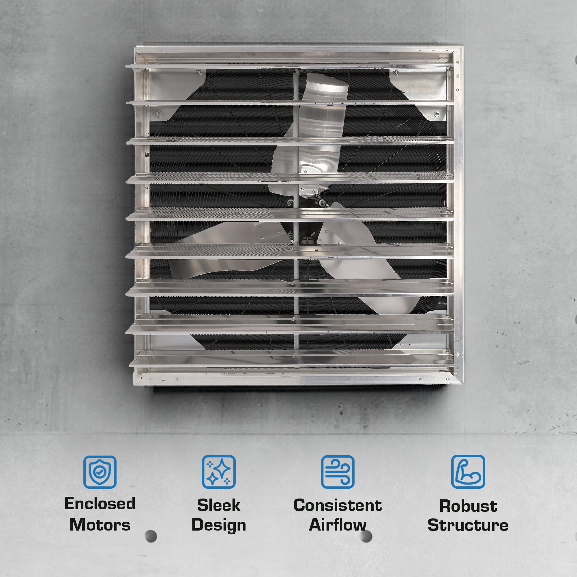 - 36-inch exhaust fan has fully enclosed motors protect against dust, debris, and moisture, ensuring safe operation and extending the fan's lifespan