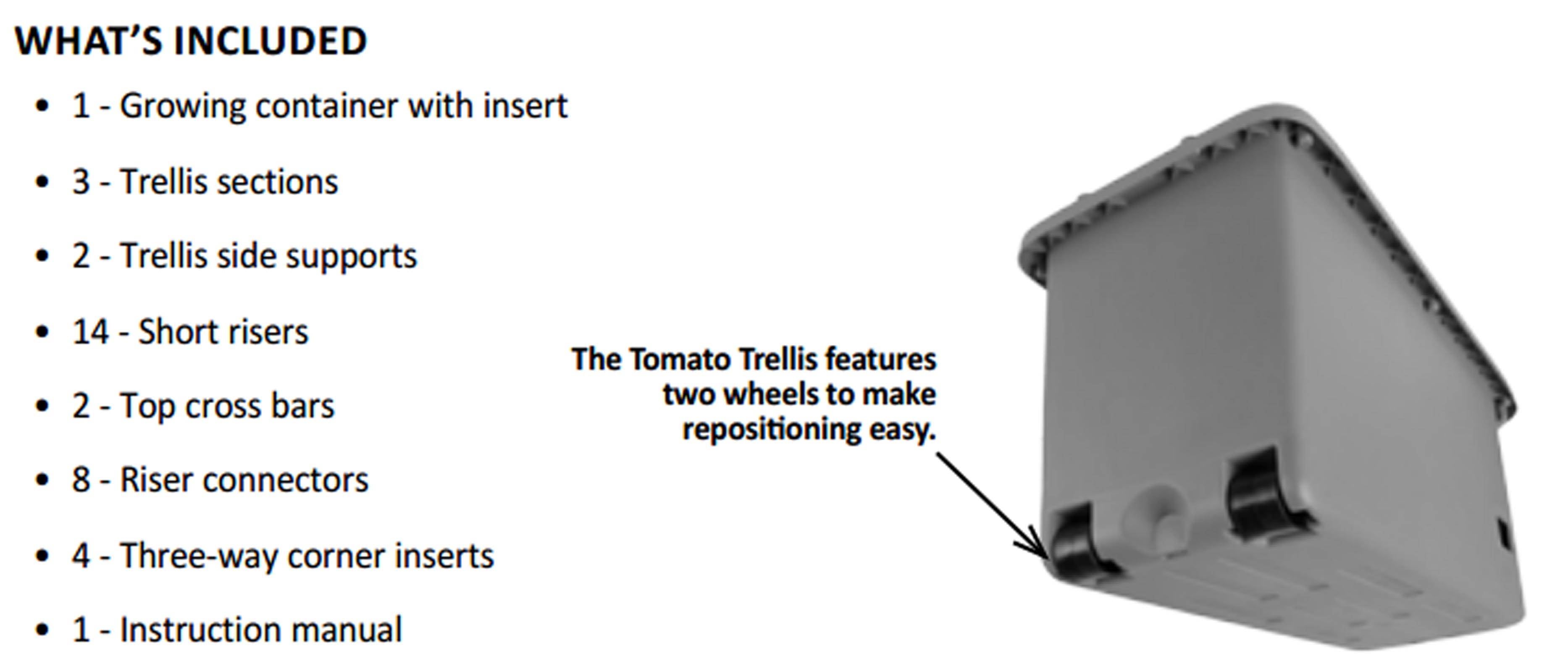 • Includes: Growing container with insert, 3 trellis sections, 2 trellis side supports, 14 short risers, 2 top cross bars, 8 riser connectors, 4 3-way corner inserts