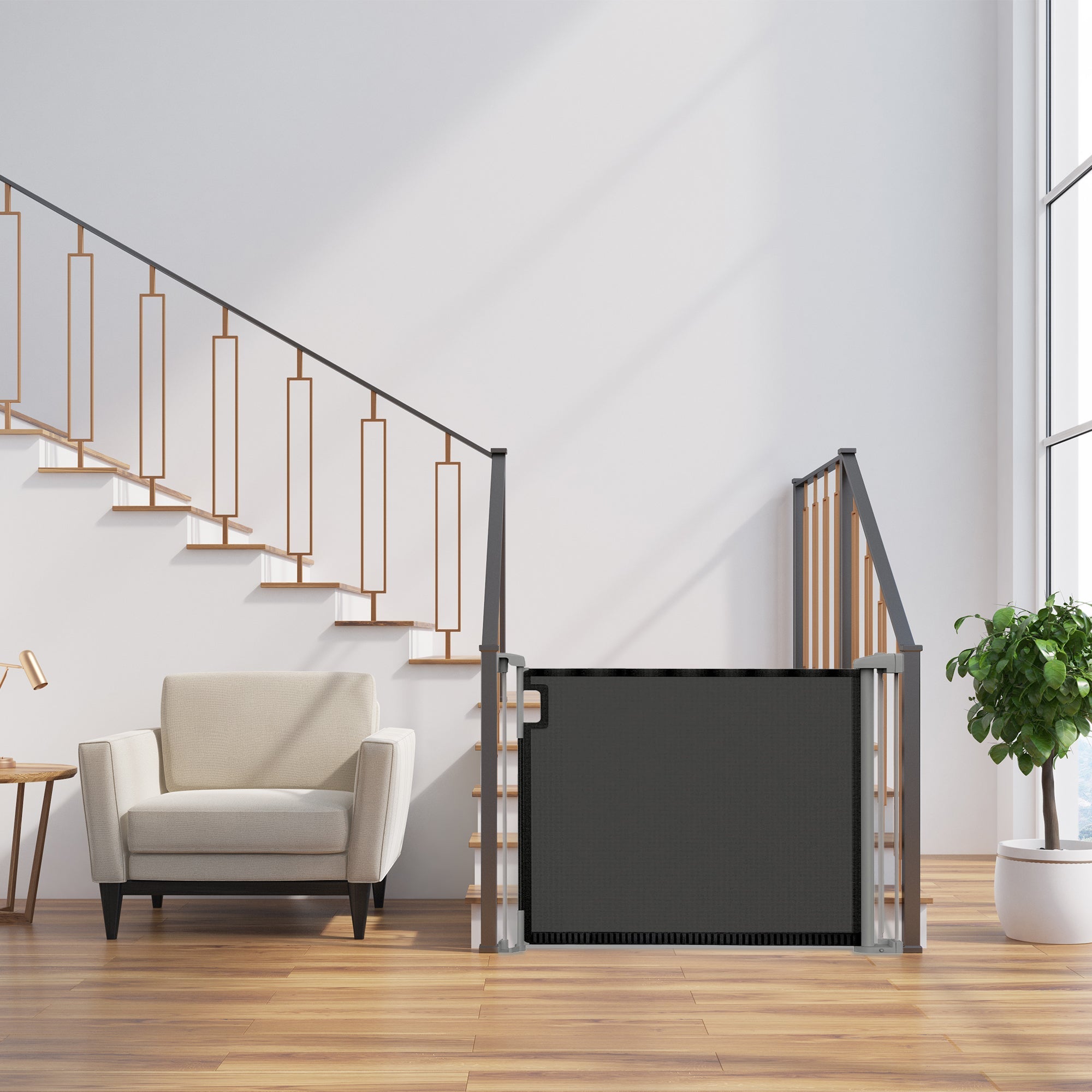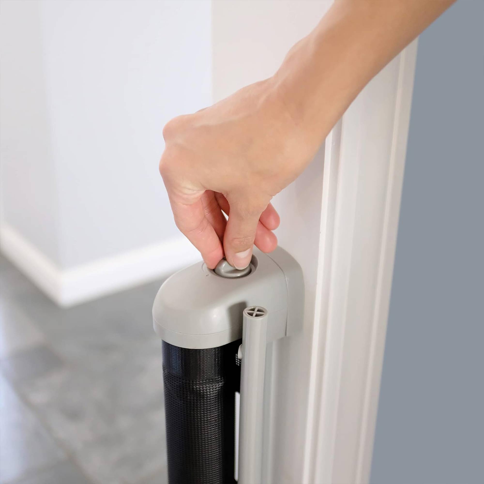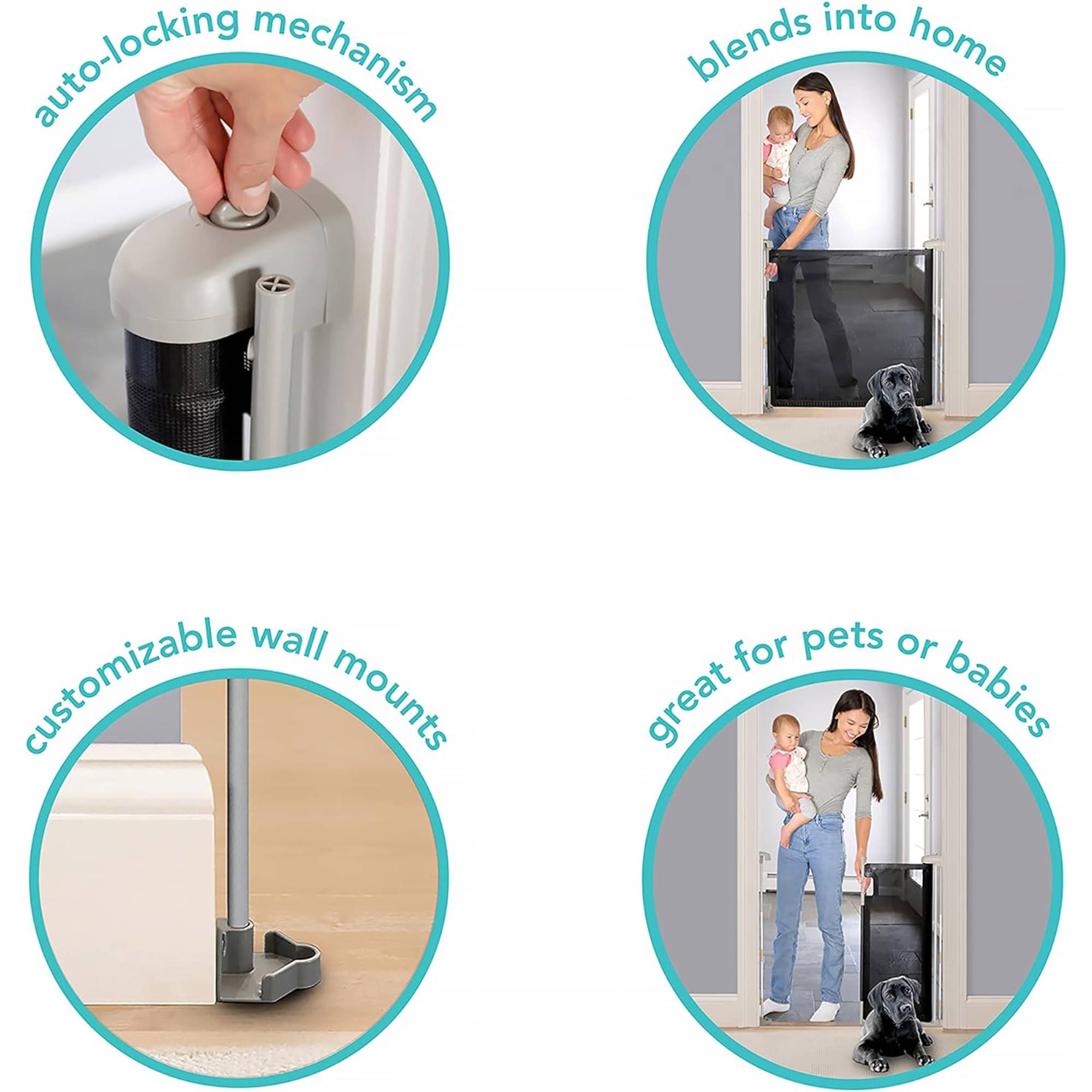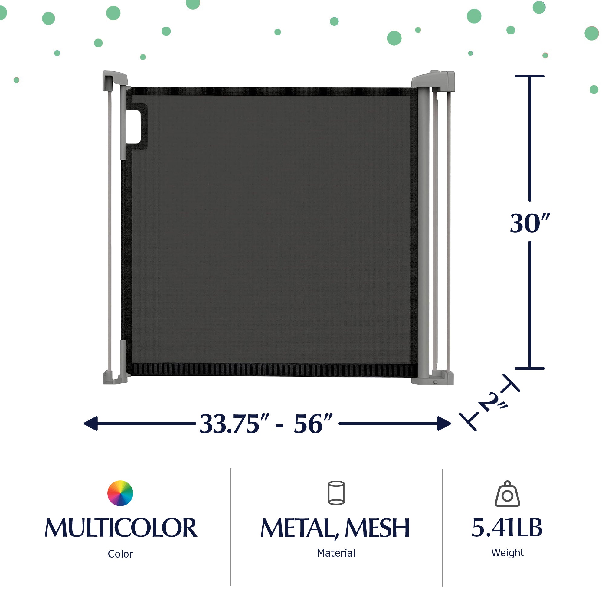 Engineered for versatility, this retractable gate is tailor-made for openings up to 56 inches wide and stands 30 inches tall to provide optimal safety for babies and pets. With an adaptable design, this stair baby gate effortlessly fits various spaces in your home, ensuring peace of mind without compromising style. Experience ease in installation with the included hardware kit and customizable wall mounts. Whether safeguarding your little one or protecting your furry friend, this mesh door gate offers a seamless blend of security and simplicity. Embrace the convenience with a unique comfort grip handle that allows for easy one-handed release of the extra-wide door that opens the entire width of the gate, while the no-threshold design minimizes tripping. Featuring a strategically placed safety strip running across the bottom of its mesh structure, this baby gate not only facilitates effortless passage but also ensures the utmost security for your loved ones. This thoughtful design element serves to firmly anchor the gate in place, providing peace of mind while maintaining a safe environment within your home