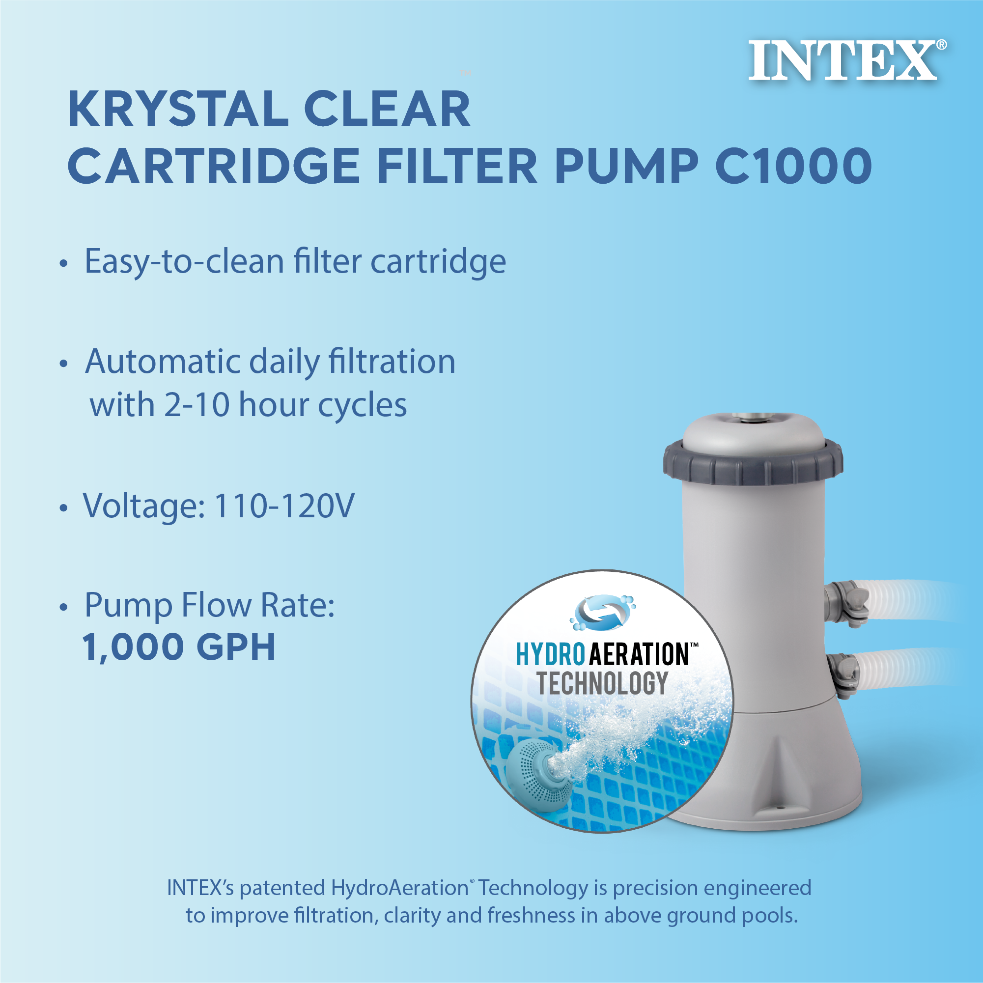 - Keep water clear with include 110-120V Krystal Clear filter pump with a pump flow rate of 1,000 gallons per hour