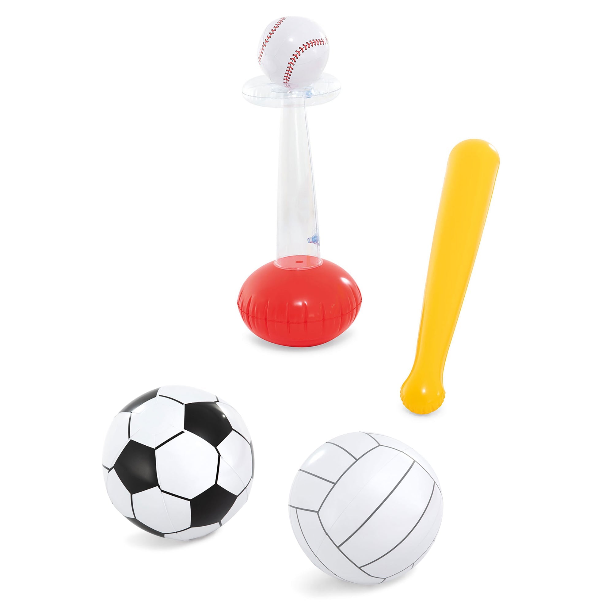 - All-inclusive set includes an inflatable volleyball, soccer ball and baseball kit with a tee