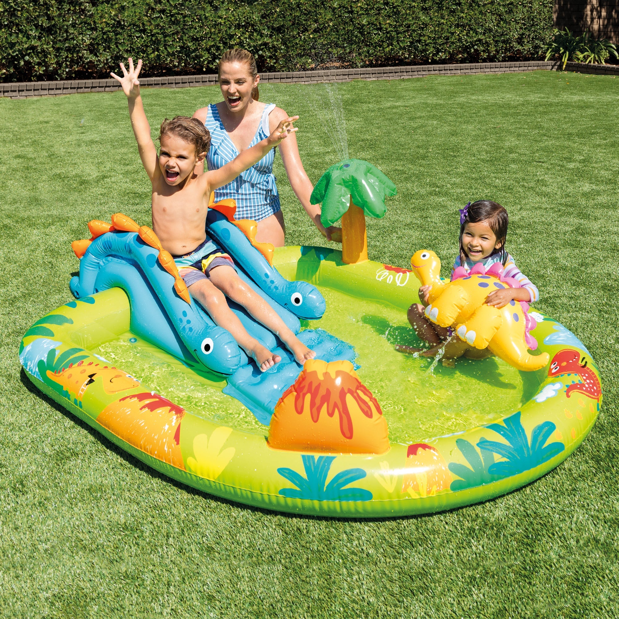 - Includes a water slide, palm tree that sprays water, and inflatable dinosaur