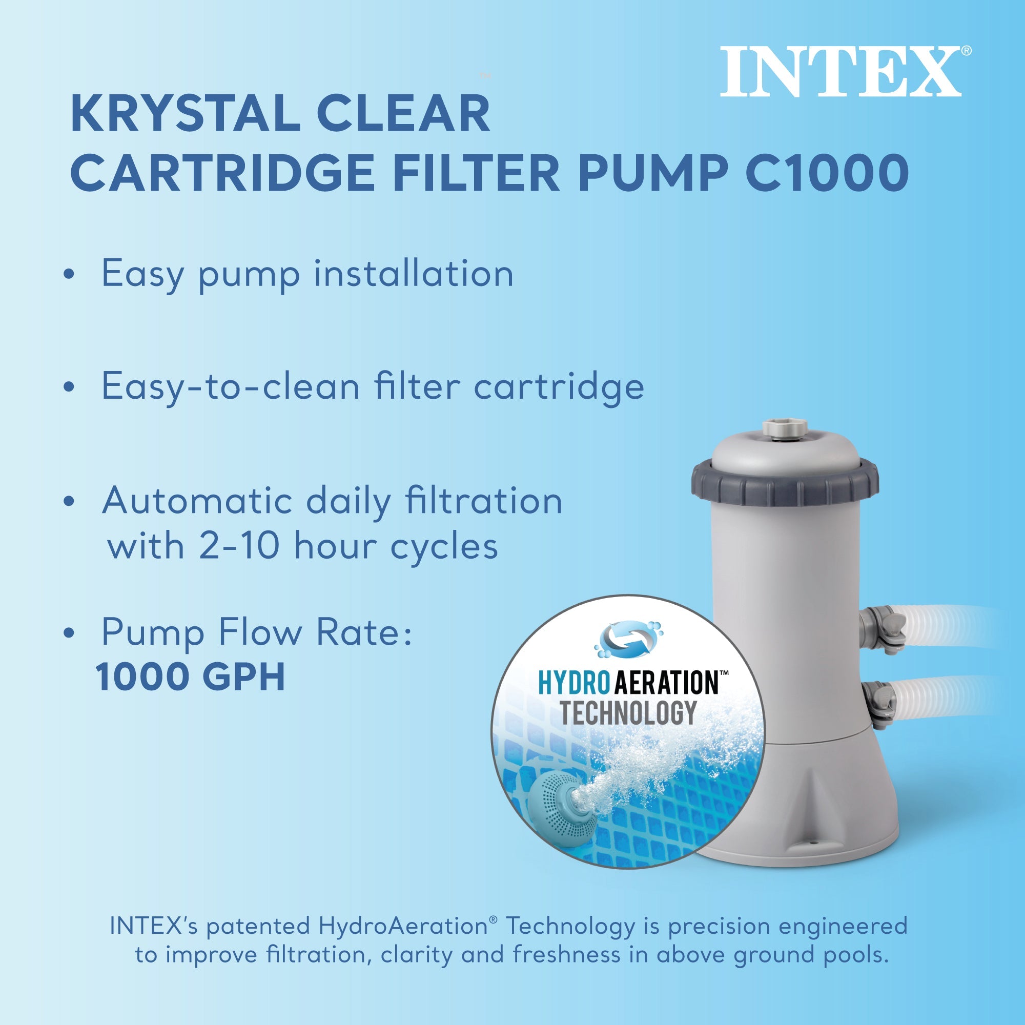 • Round swimming pool comes with a 1,000 GPH filter pump, Type A Krystal Clear cartridge filter, a ladder, and ground cloth
