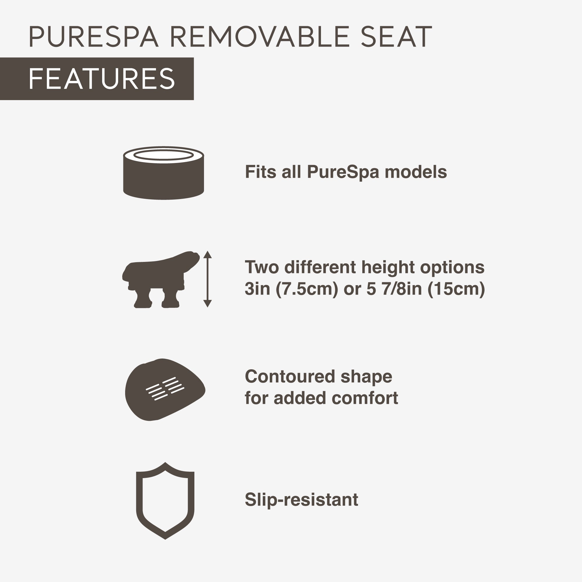 The slip-resistant PureSpa seat allows you to sit comfortably in the spa and gives you added height with 2 different height options of 3 and 5.8 inches. Being able to choose your ideal height means that the seat can work better for you. This spa seat is also made with the same color scheme as your inflatable PureSpa hot tub, so it won't stick out as an eye sore in the water. This comfortable seat also has a laminated finish to protect against wear and tear. To help fit in the spa, this seat features a contoured shape that caresses your back while you soak. The seat is removable for your convenience and fits all PureSpa models.