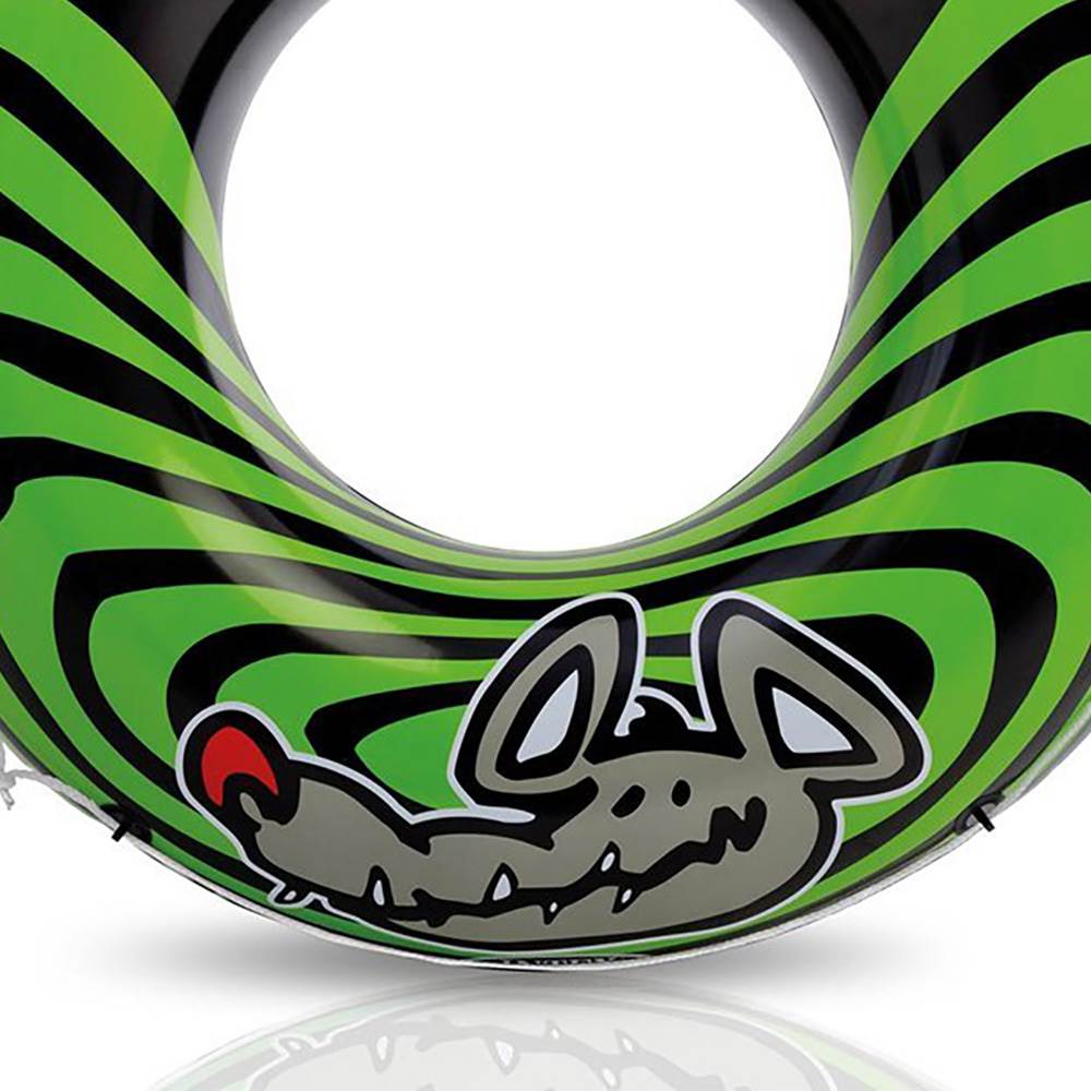 Designed with bold stripes and a fun cartoon rat image, this 48-inch tube is ideal for ages 9 and up and looks great out on the water. Constructed with durable vinyl, the River Rat is tough enough for all your water fun. It features an all-around grab line for easy handling, dual air chambers and double valves, and comes with a repair patch kit if needed.