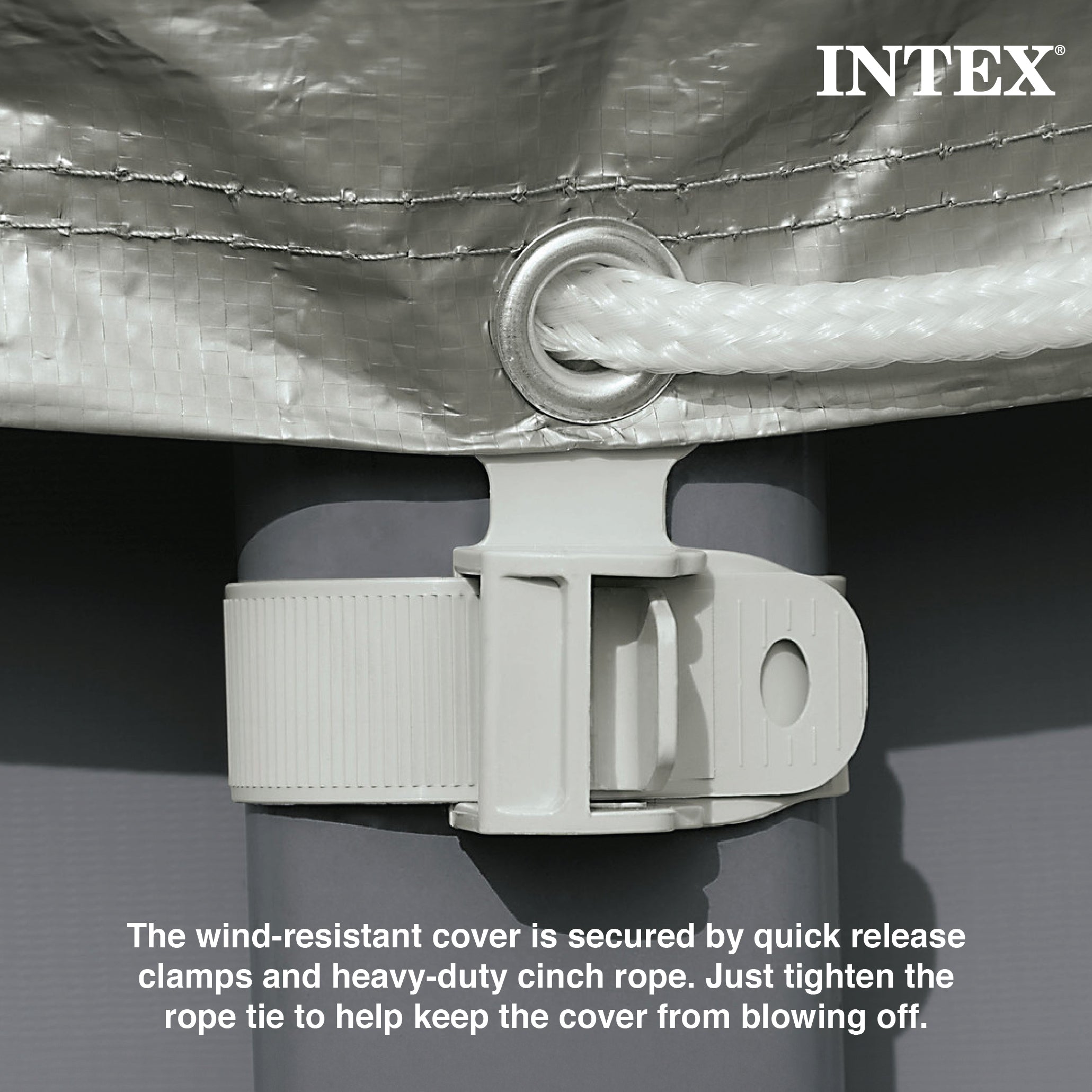 For 18-foot Intex Ultra Frame pools, this cover features an 8-inch overhang, a tighten rope to keep the cover from blowing off, drain holes to prevent water accumulation, and UV-resistant material to protect it from fading.