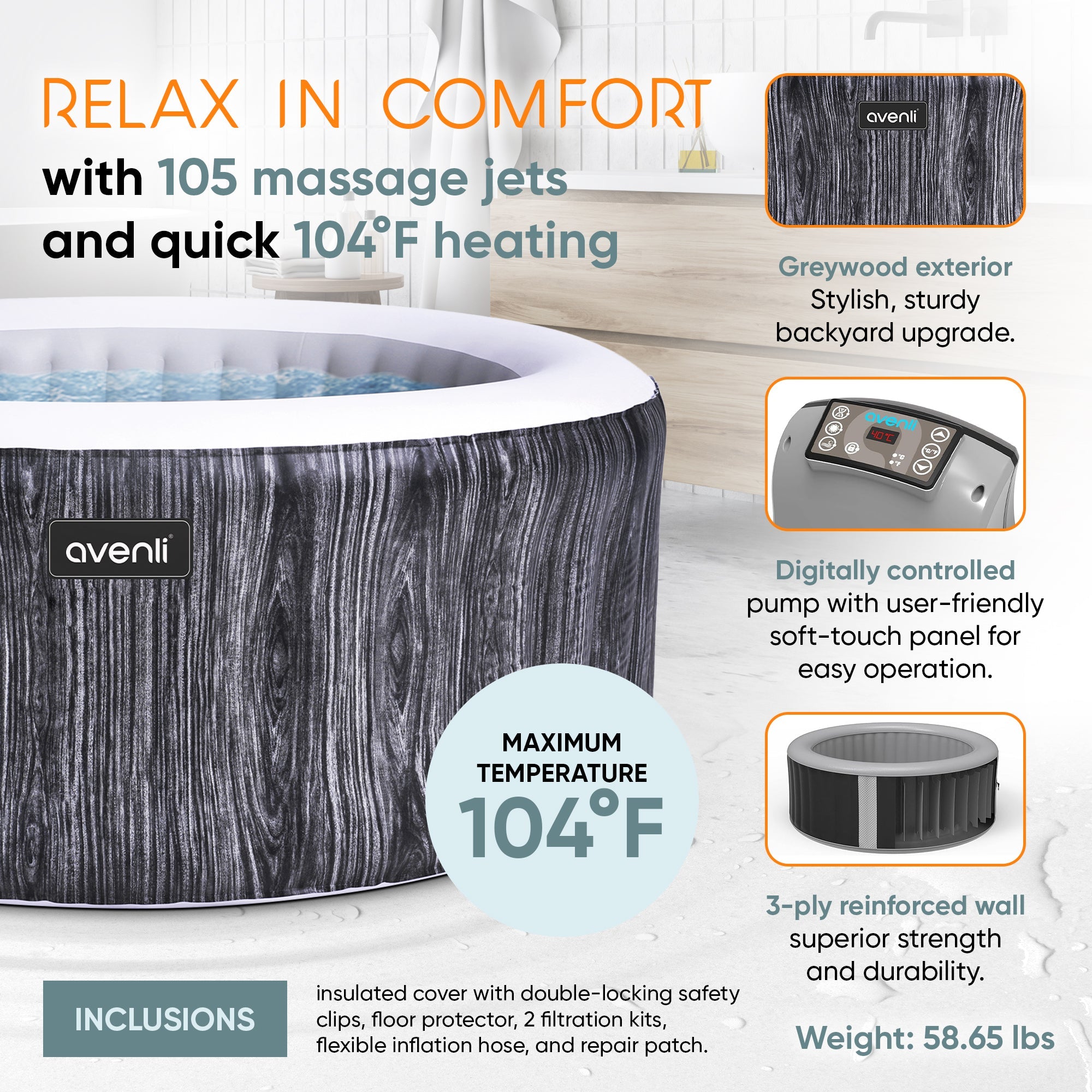 - Comfortable relaxation with 105 soothing massage air jets and a 104-degree Fahrenheit rapid heating system