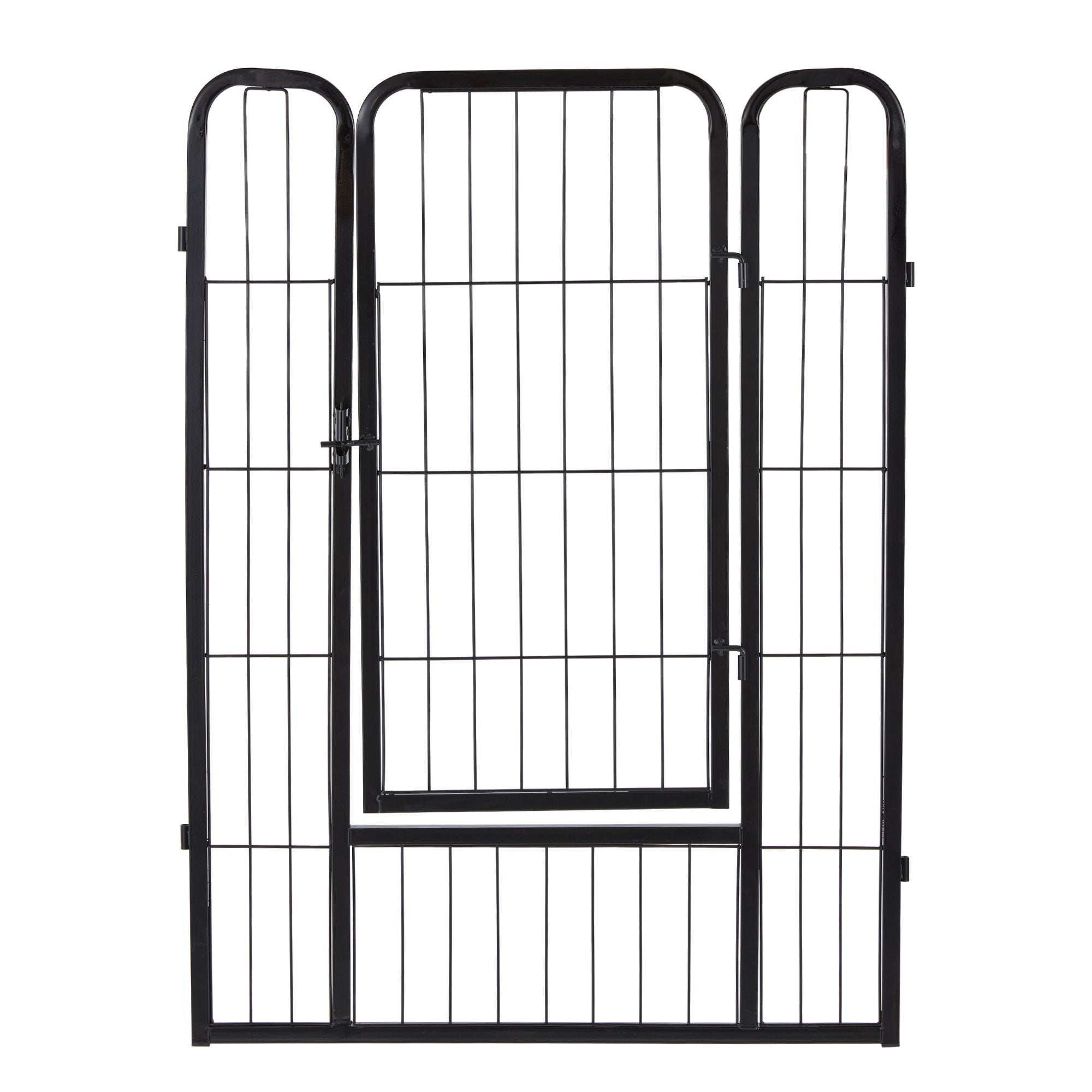Measuring 32 inches high by 24 inches wide, each of the 8 panels is easily linked together for a simple and tool-free assembly. If you have more than 1 of these lightweight and fully collapsible 8-panel pens, you can easily move them around or merge them together for a roomier playpen and versatility with configurations. One of the panels integrates a lockable entry and exit door for easy access while training, feeding, or catching that crazy pup. The powder-coated metal construction protects against rust, making it ideal for camping, traveling, or setting up in the yard.