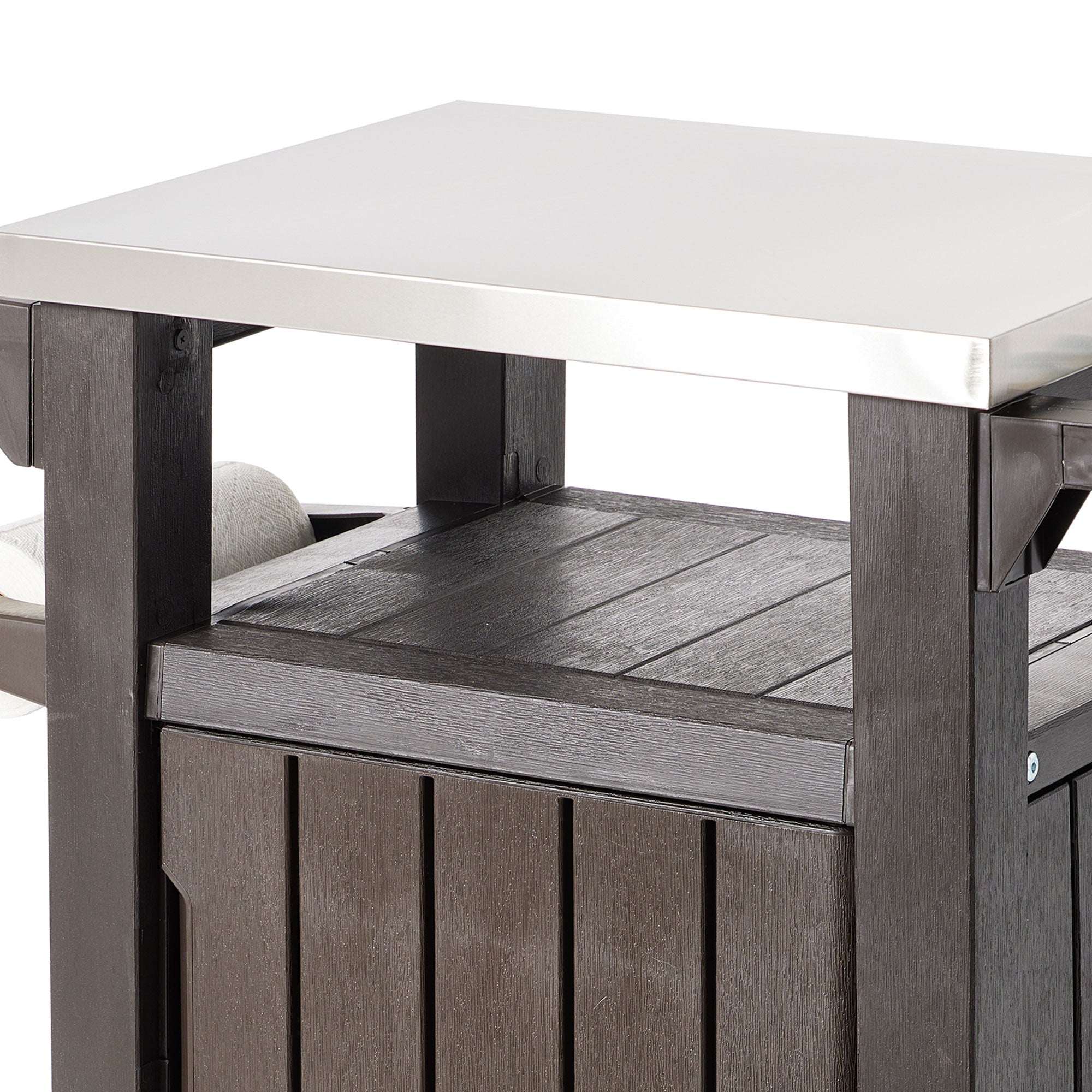 - Constructed of weather-proof polypropylene materials with a stainless-steel countertop that offers efficient space that can support up to 66 pounds for long-lasting use