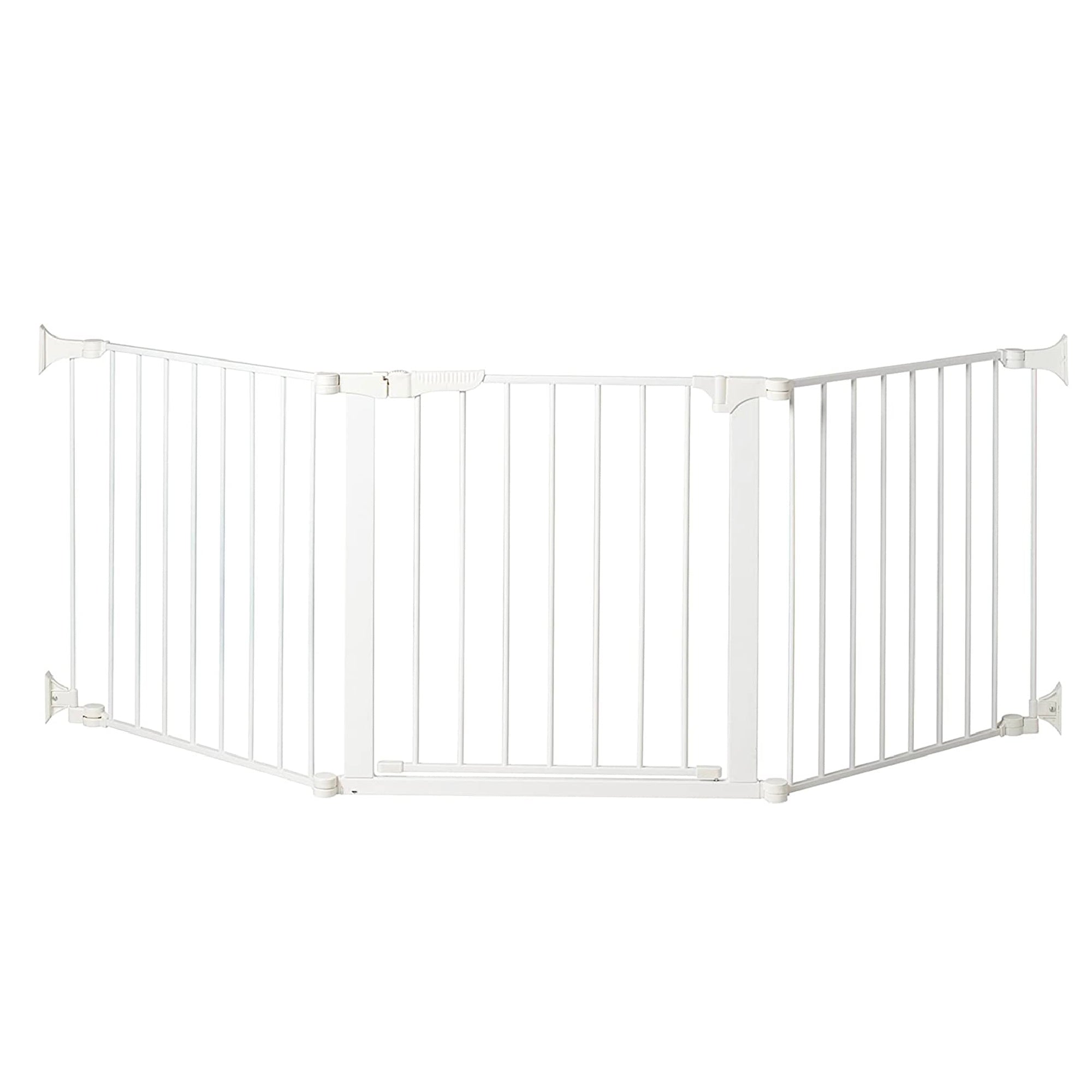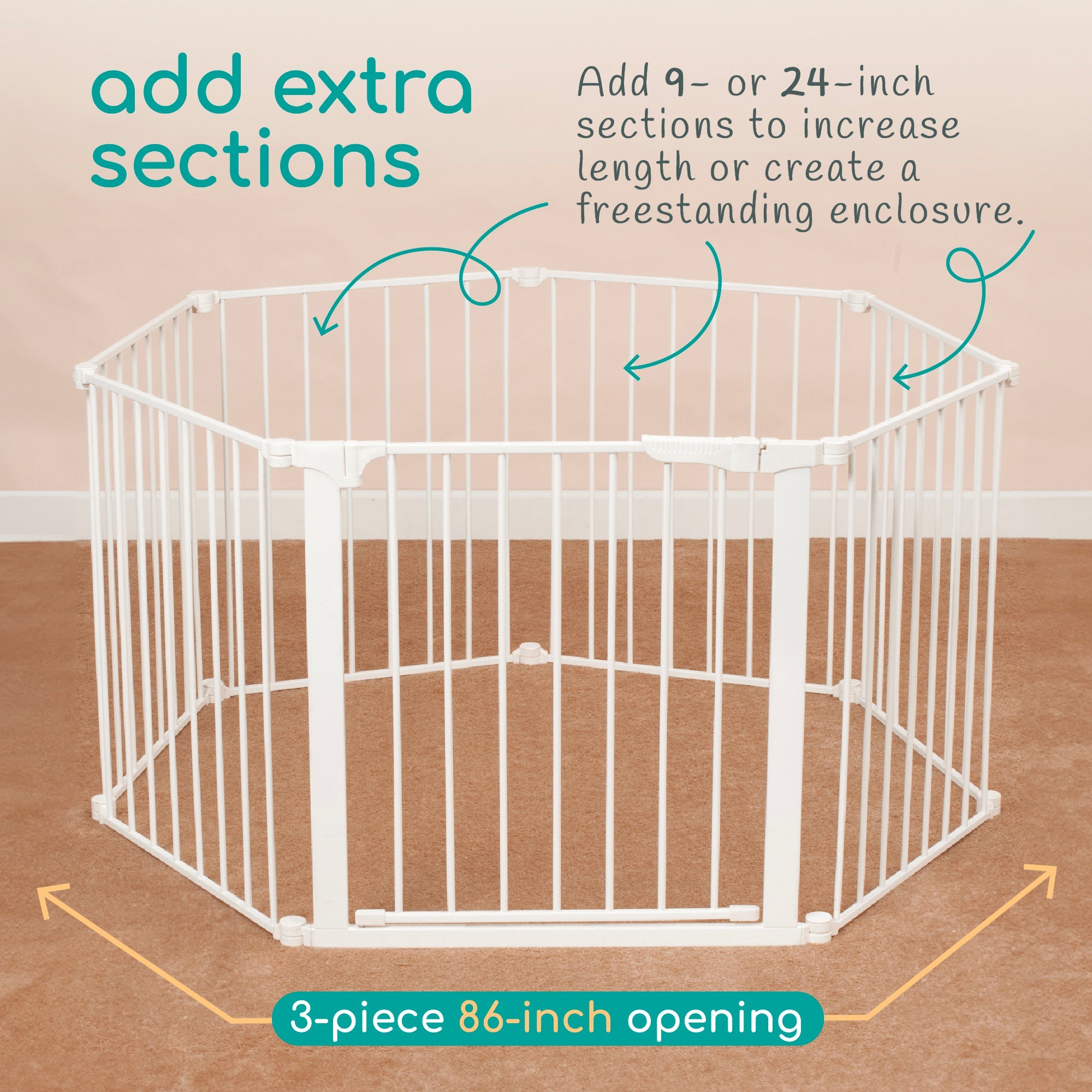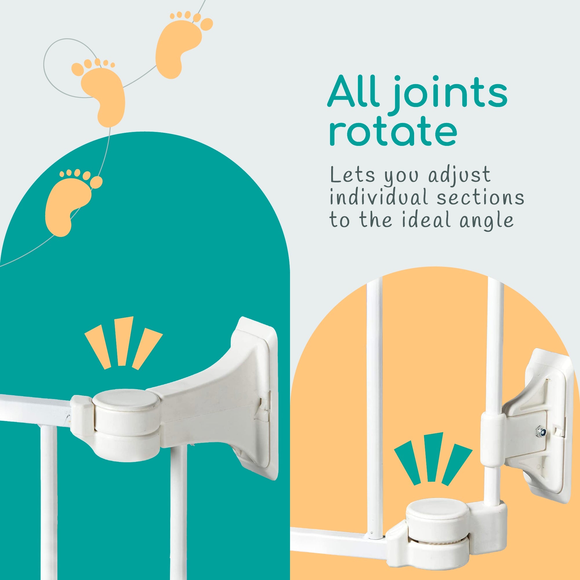 Constructed from heavy-duty steel, this ConfigureGate door was built to provide ultimate protection in any odd-shaped or extra wide area. All joints easily rotate and then lock into place for secure attachment. The unique handle design applies magnet-lock technology with a dual magnet design that automatically draws the door shut, closing the gate securely each time. With a hold-open feature, you can keep the door open until pushed back close. This 3-piece safety gate will fit up to an 86-inch opening with the ability to link an unlimited amount of 9-inch or 24-inch sections to fit any desired length or to make a free-standing enclosure for a baby playpen (Sold separately). Quick-release adjustable wall mounting hardware allows you to mount the gate if needed.