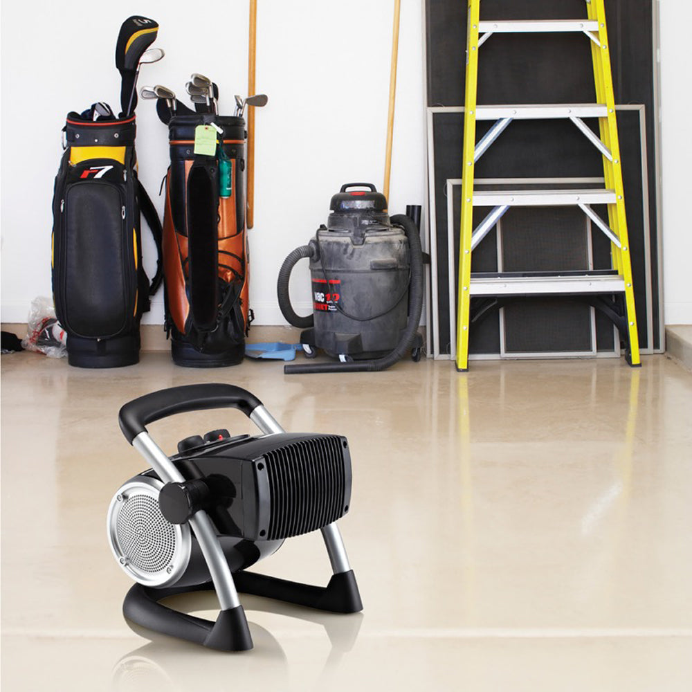 Place this utility space heater to any worksite. Thanks to a built-in carry handle and cool-to-touch housing, the space heater moves easily. Its compact design fits anywhere, measuring 11.5 inches long, 8.5 inches wide, and 11 inches tall.