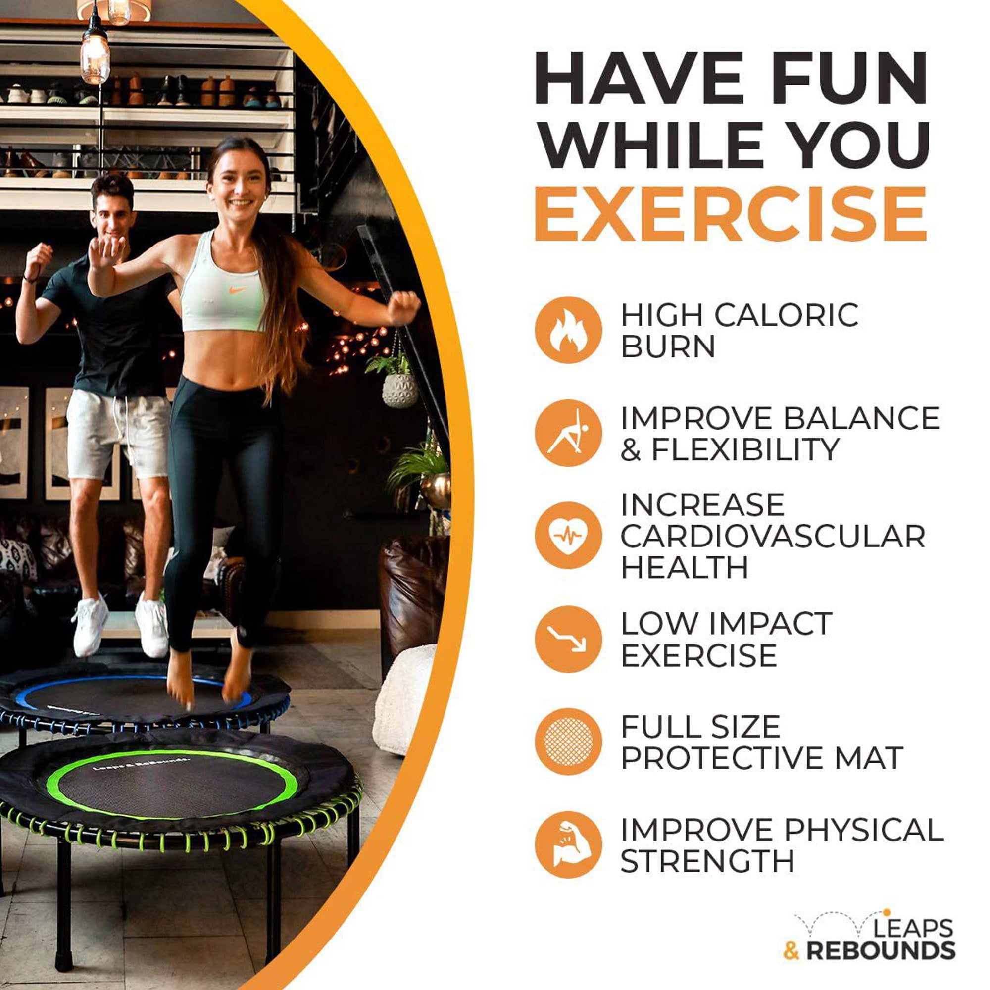 Ditch the gym and put some bounce into your life with the LEAPS & REBOUNDS 48-Inch Mini Fitness Trampoline and Rebounder.