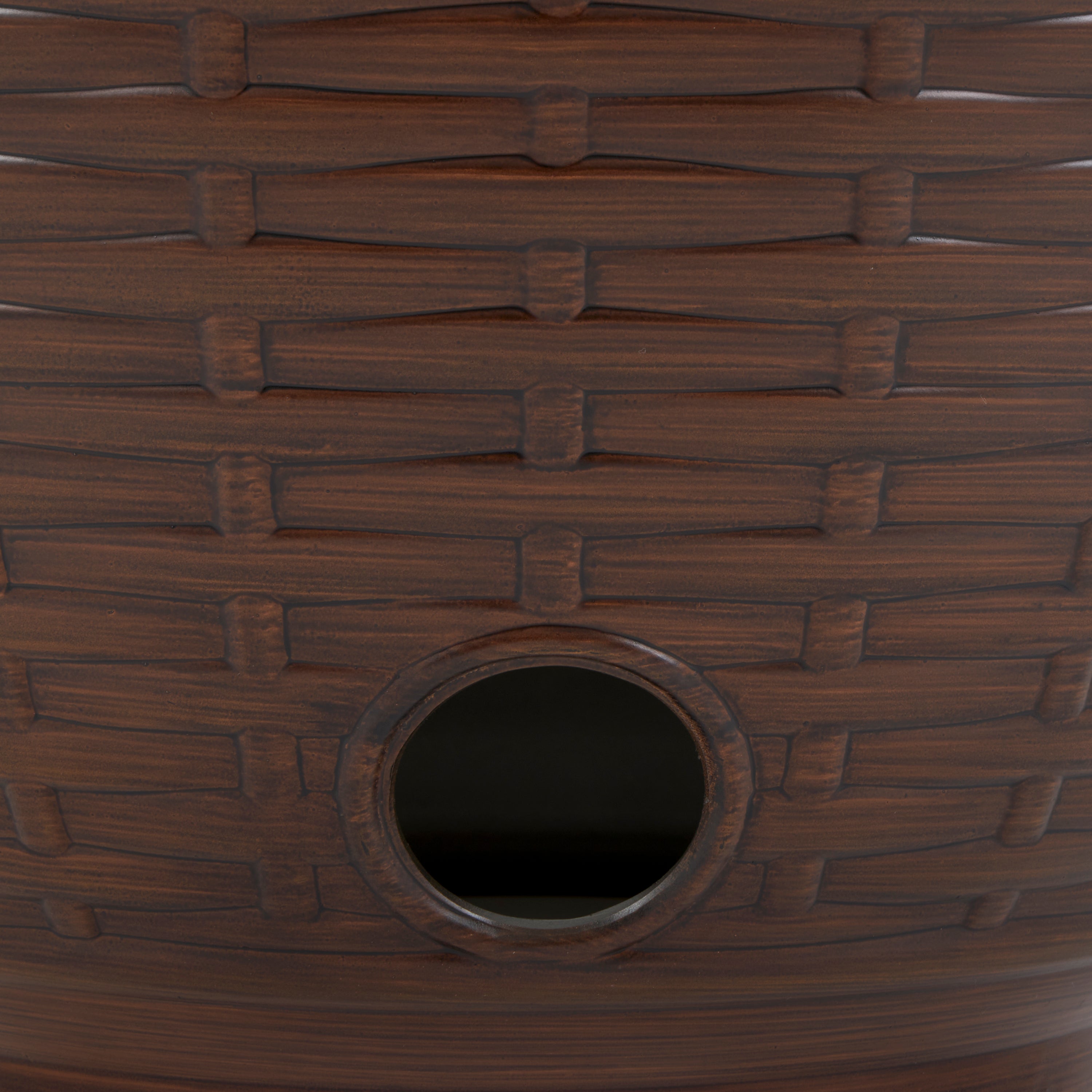 This hose storage pot makes garden hose storage simple and easy for anyone to do. The convenient and clandestine storage solution stores up to 100 feet of 5/8-inch gauge hose, though you can store just about any hose you have. The pot features a durable, high-density resin construction that holds up to the outdoor elements while remaining lightweight for convenient movement around the garden or outdoor area. Designed with an inlet port for water connection and a stylish bronze wicker basket design that conceals the hose within, this hose pot will compliment any home or patio decor without drawing attention to itself. Hose is not included.