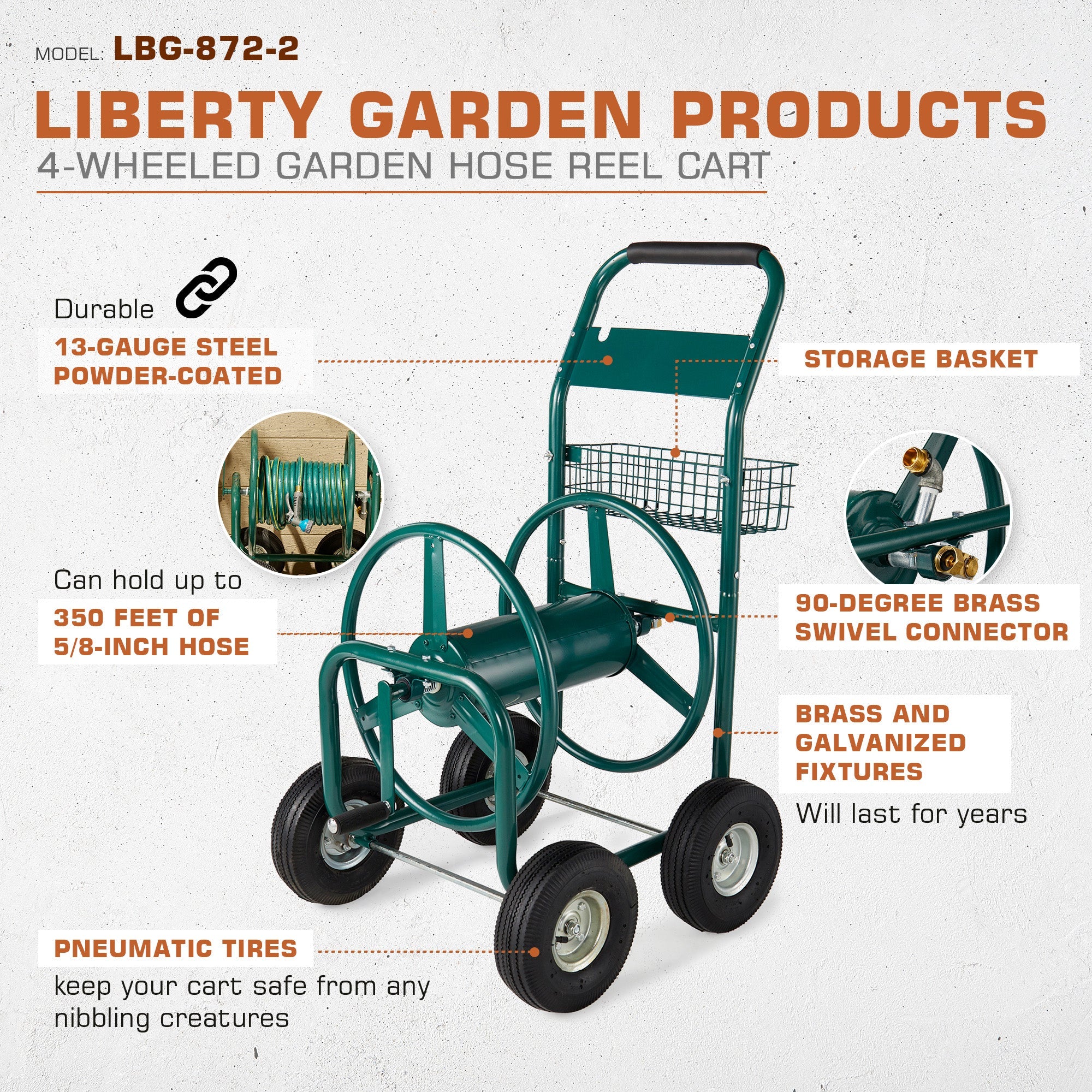 Pneumatic tires keep your cart safe while the 5-foot leader hose with a 90-degree brass swivel connector allows you to water from gate to gate with ease. This cart can handle up to 350 feet of 5/8-inch hose.