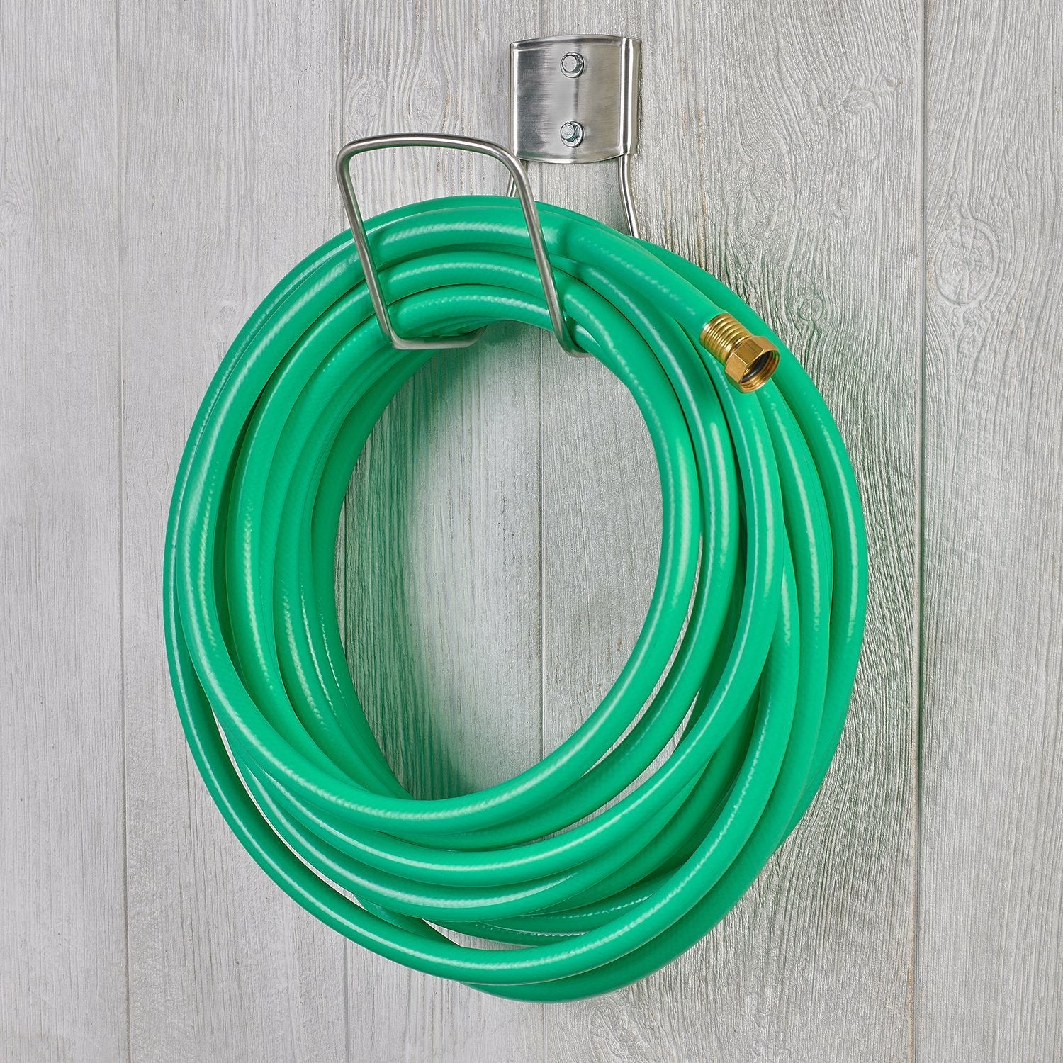 In addition to taking care of your hose, this hose holder takes care of itself. Constructed from durable stainless steel rustproof material, this hanger will outlast even the harshest weather.