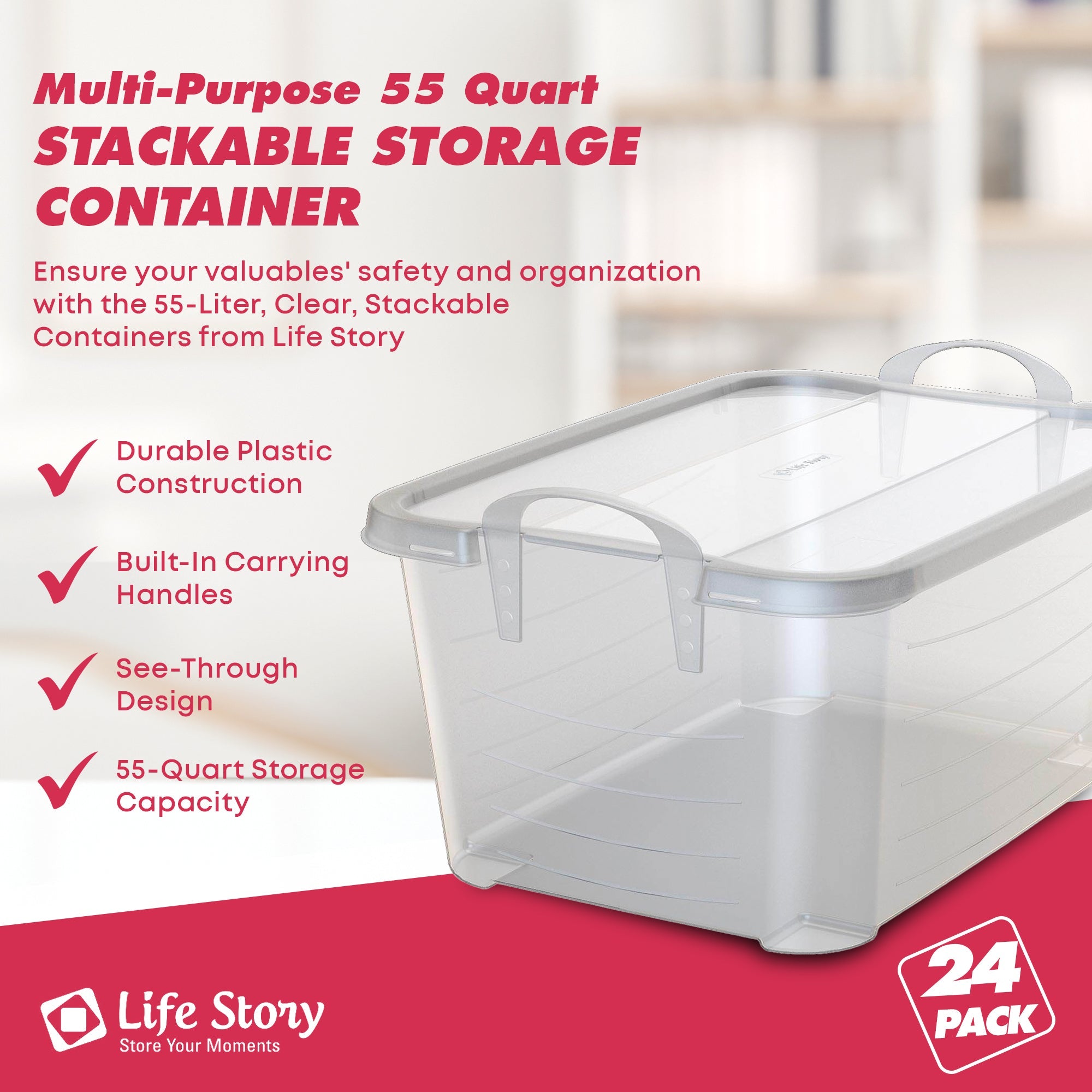 Life Story 55 Quart Stackable Storage Bin, Light Duty Container, Clear, 24 Pack