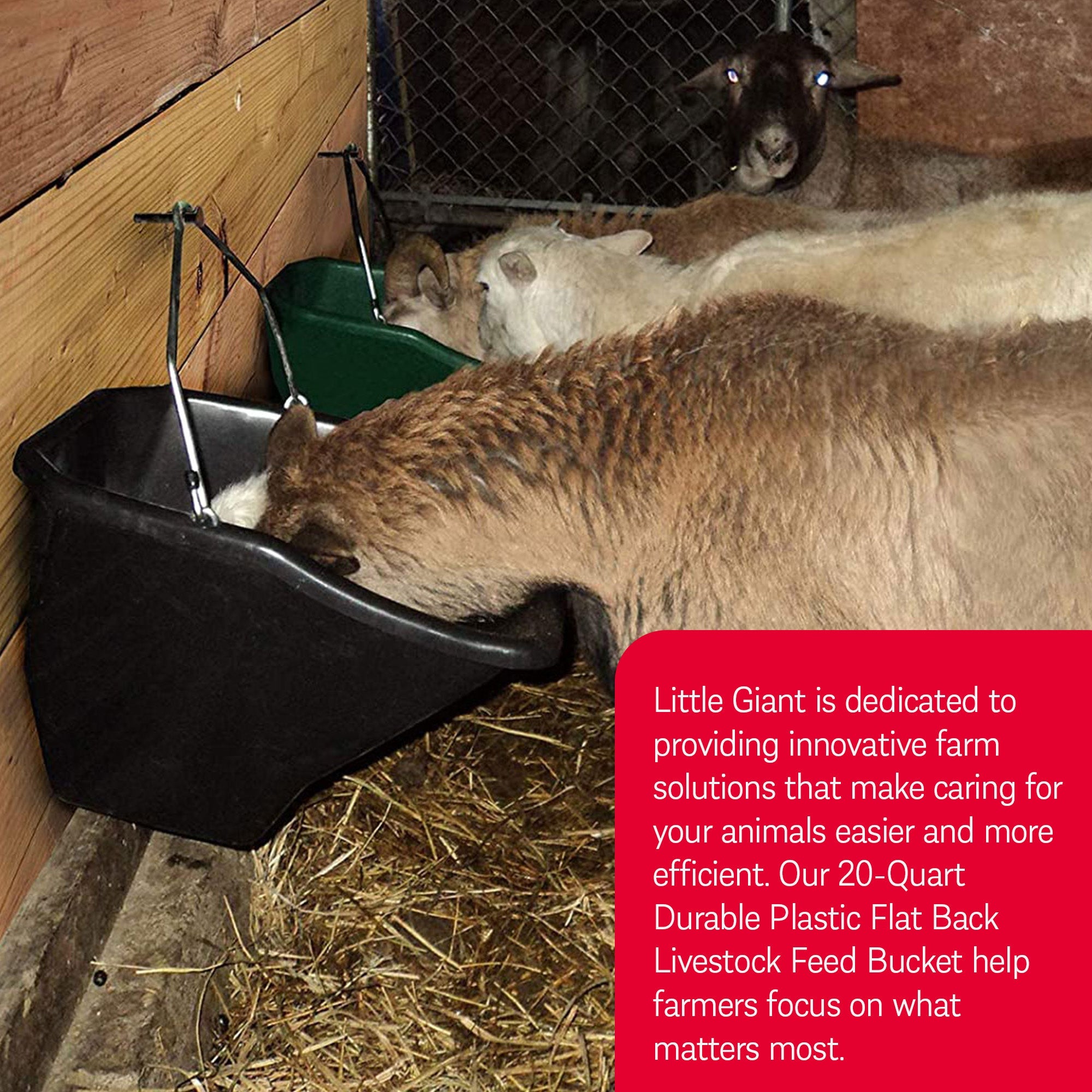 This patented, ergonomically designed Little Giant 20-Quart Durable Plastic Flat Back Livestock Feed Bucket is excellent for horses, cattle, and other livestock. The angular design better accommodates an animal's facial structure, allowing a more natural eating posture and reducing animal behavioral problems associated with feeding.