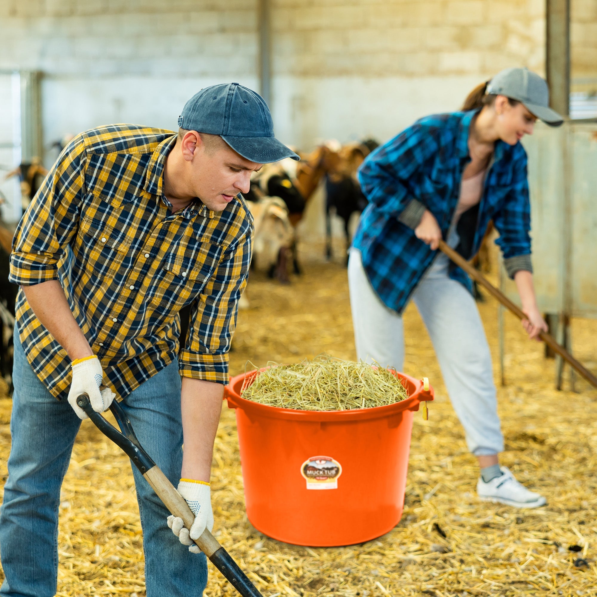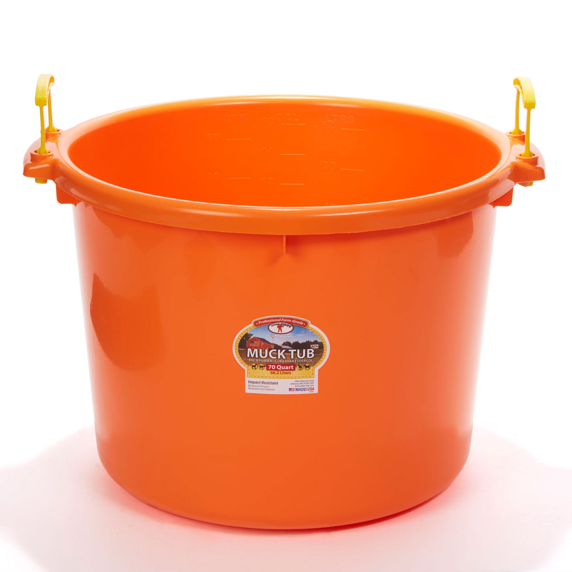 - Multi-purpose 70-quart plastic tote bucket ideal for mucking, barn cleanup, and gardening