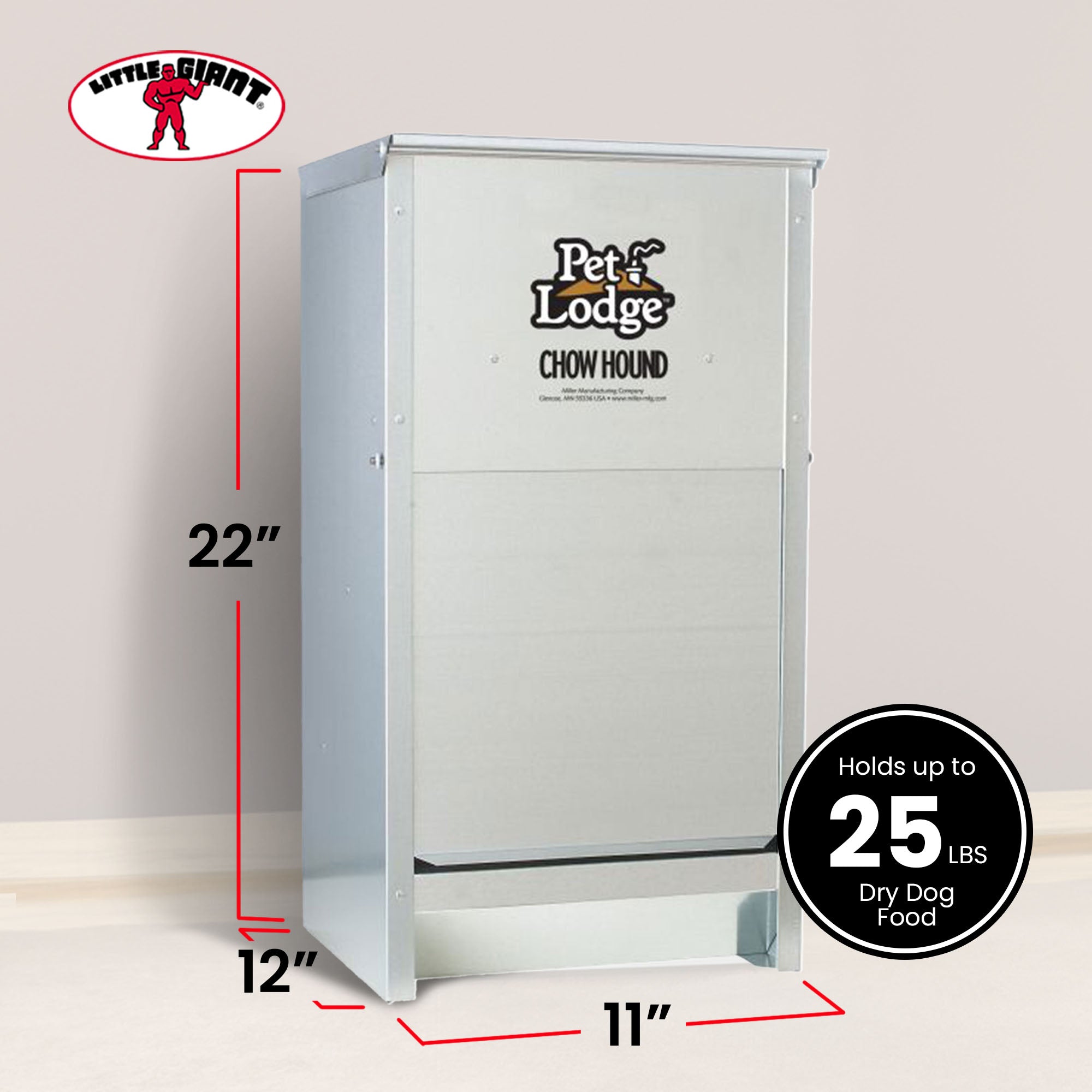 You and your dog never had this easy. Safely store dry dog food and feed it from the same chew-proof container. The Chow Hound Automatic Dog Feeder is manufactured from tough galvanized steel for durability and rust resistance. The magnetized door stays shut until your dog nudges it open, keeping unwanted pests out. A specially angled chute provides a steady food flow on demand. Food stays fresh, dry, and pest free. The feeder can be mounted on a wall by the backside keyholes or frame (not included). The Automatic Pet Feeder comes fully assembled and can hold 25 pounds of dry dog food.