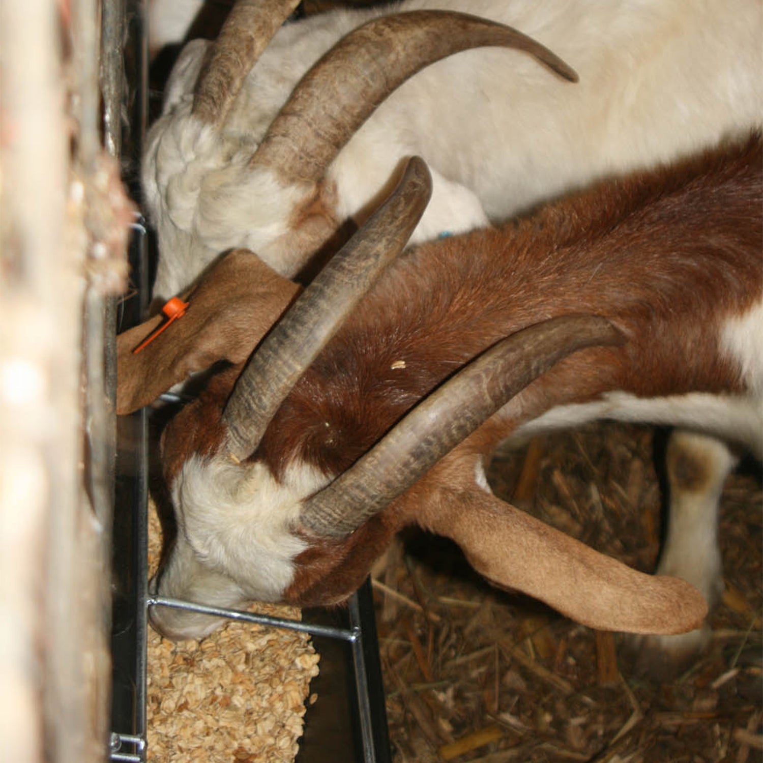 - Hook-over feeding trough with six slots for goats, sheep, alpacas, and llamas