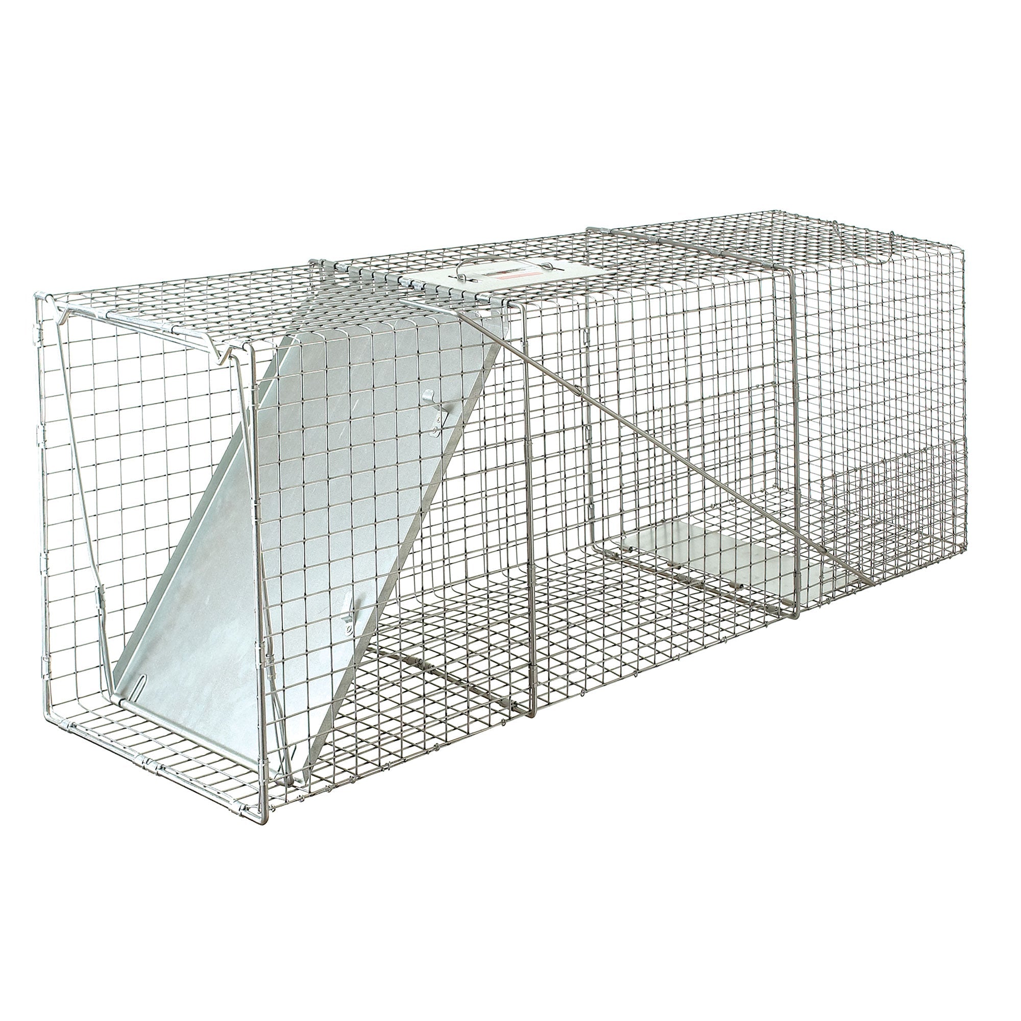 This live animal trap catches animals so they can be humanely disposed of or relocated. The container itself is made of heavy galvanized wire mesh with steel reinforcement that won't buckle when faced with extreme outdoor conditions or aggressive animals. The cage features a spring-loaded door that is easy to bait, set, and quick to release, while the convenient carrying handle provides easy portability. The cage's 42-inch size works great for raccoons, foxes, cats, dogs, and other similar-sized animals. This animal trap specifically measures 42.25 inches long by 16.75 inches wide by 16.75 inches high.