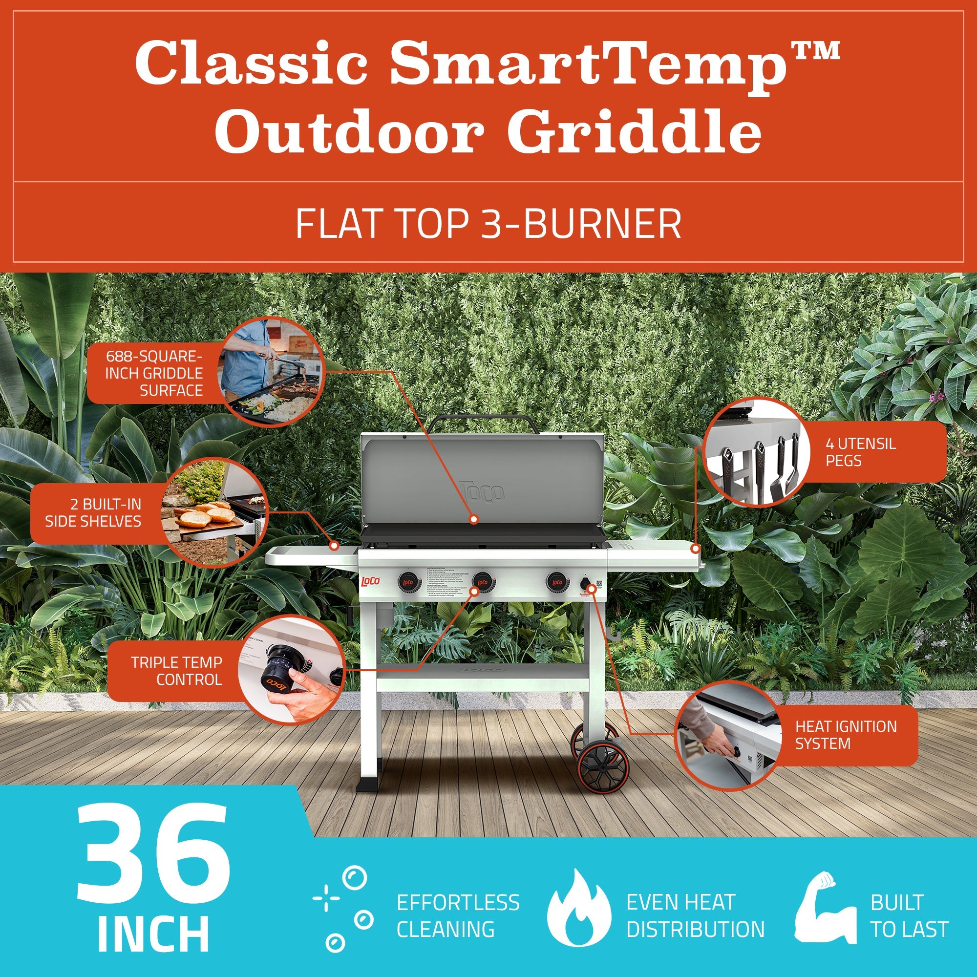Cook your heart out with the Loco Cookers 36-inch 3-Burner Classic Gas Grill and 5-Piece Griddle Accessory Kit.