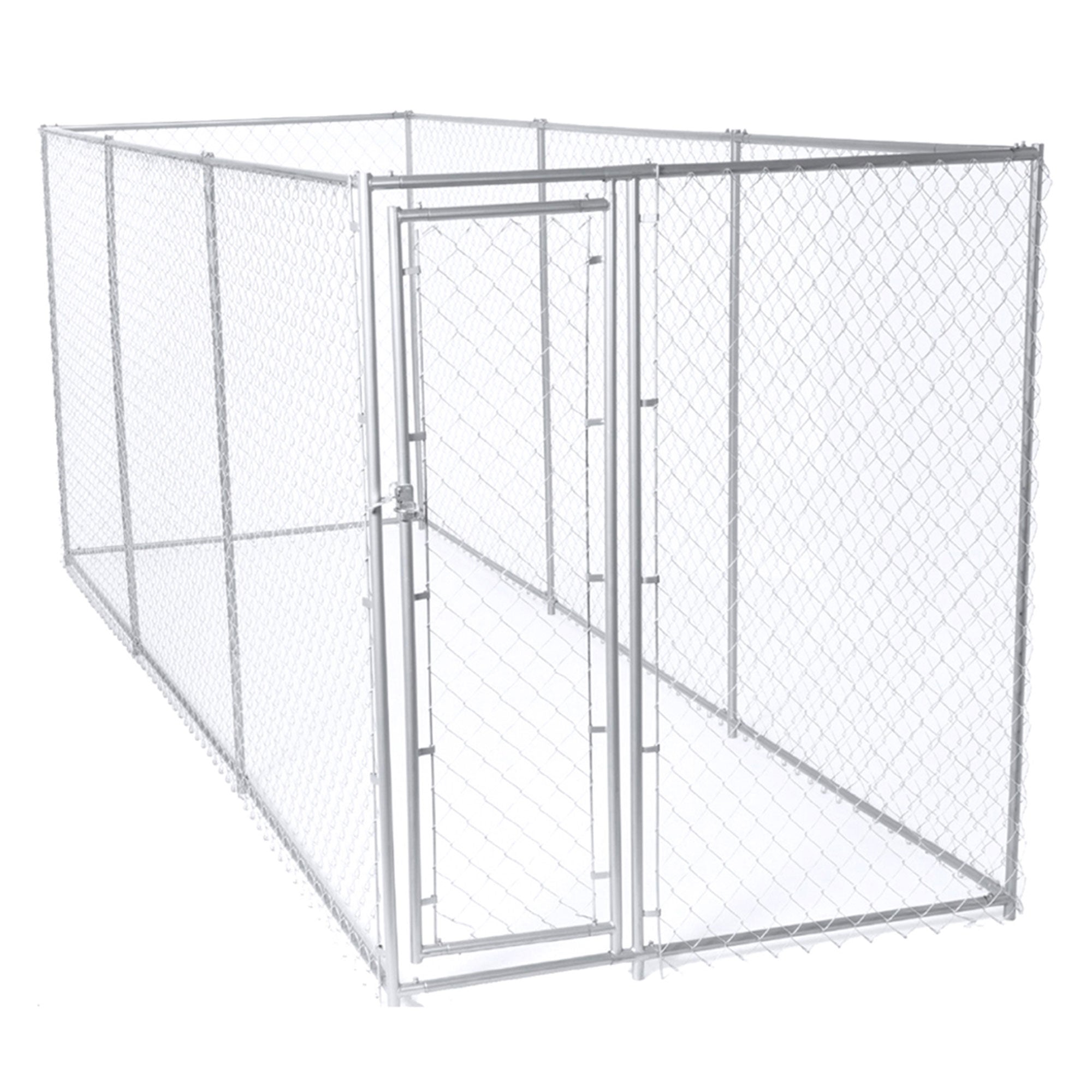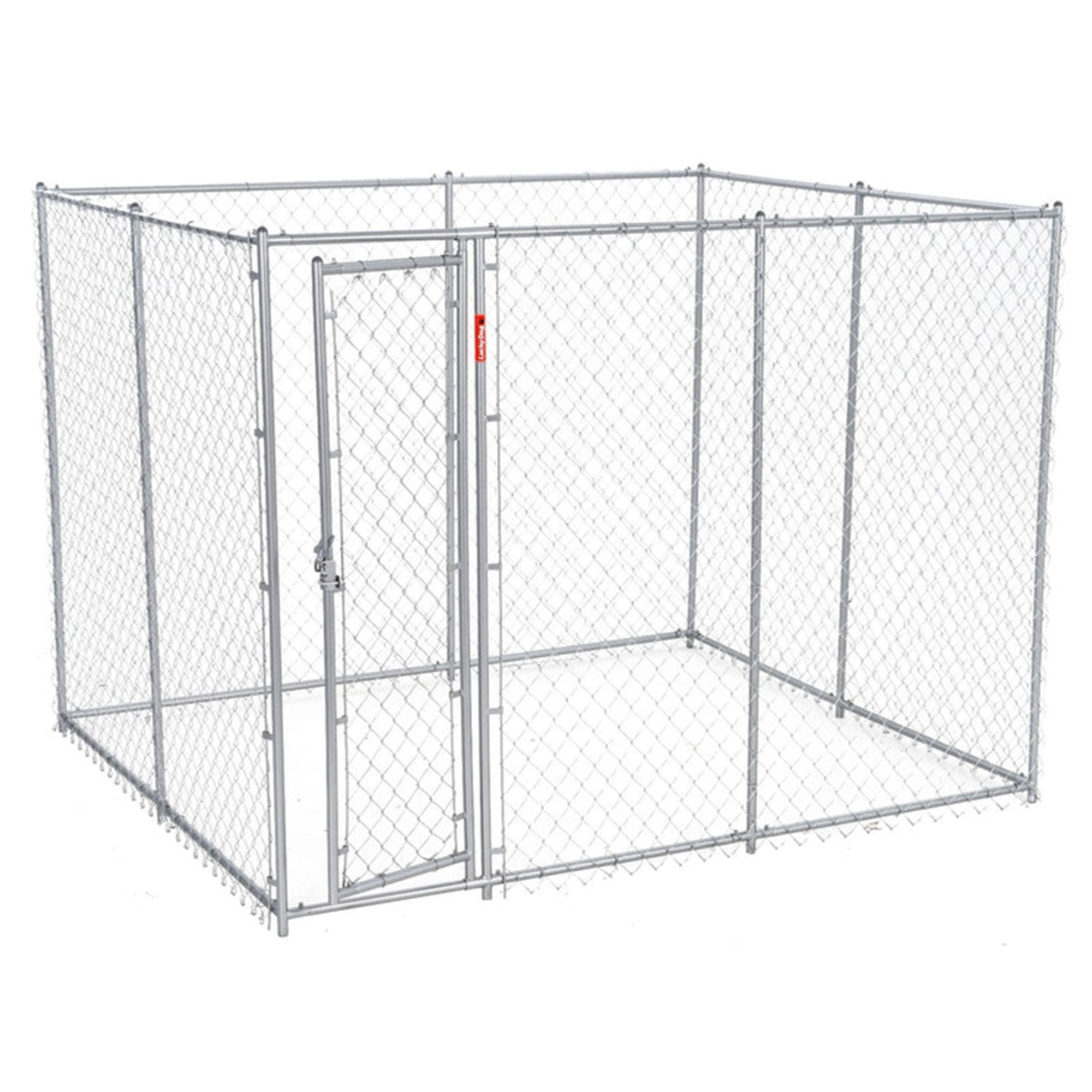 This outdoor dog kennel is functional and flexible with its easy setup for 1 person and 2 design configurations, either 10 by 10 feet or 5 by 15 feet. Constructed out of a durable powder-coated steel frame with a galvanized chain link, this dog playpen is designed to withstand heavy outdoor use in all kinds of weather. It measures 6 feet in height with a built-in door for easy entry and exit, as well as a 1.5 raised leg height, so it's easier to sweep or hose out.